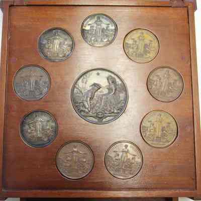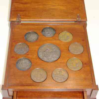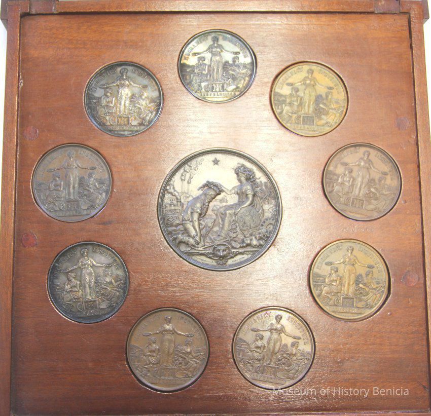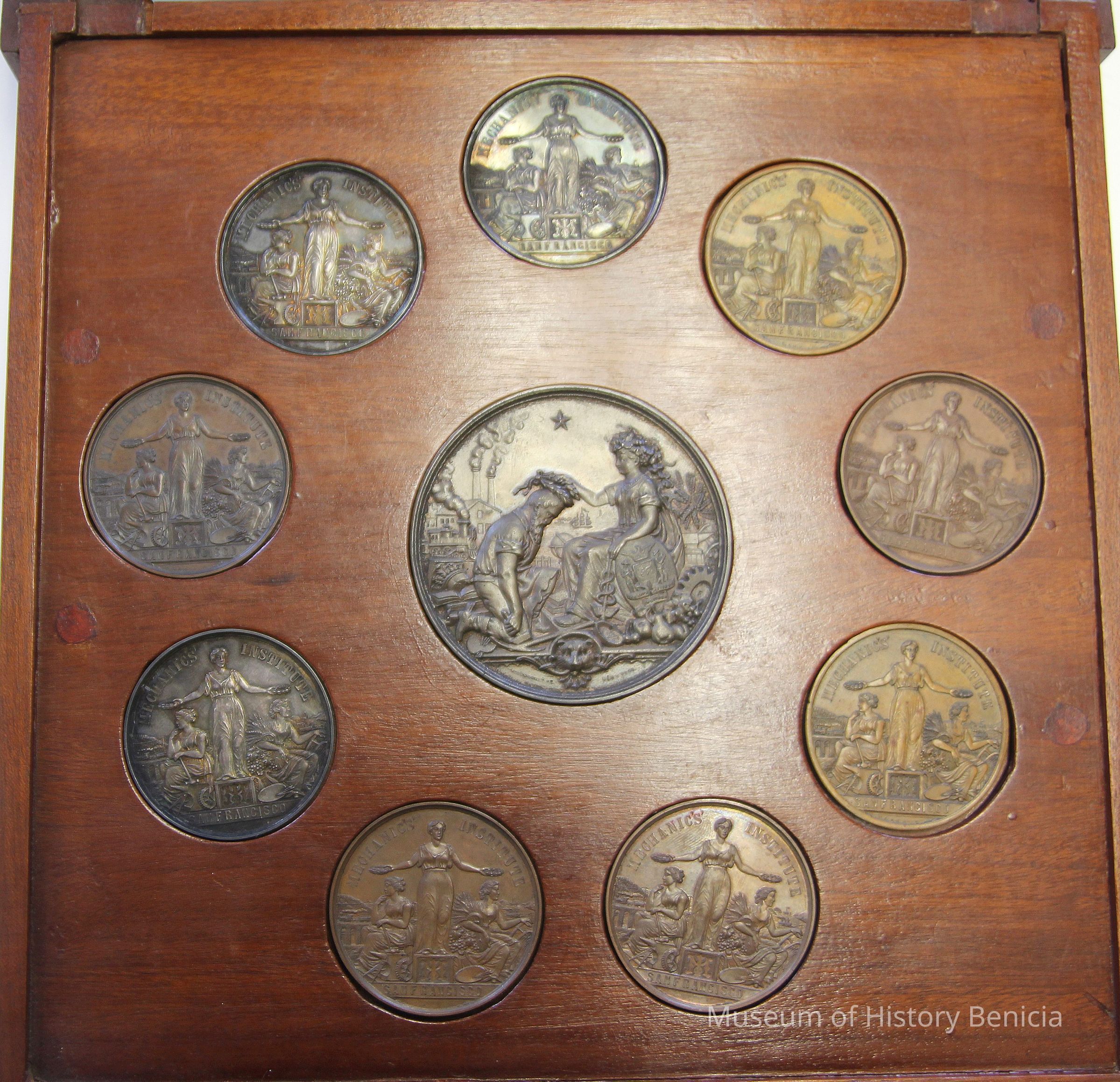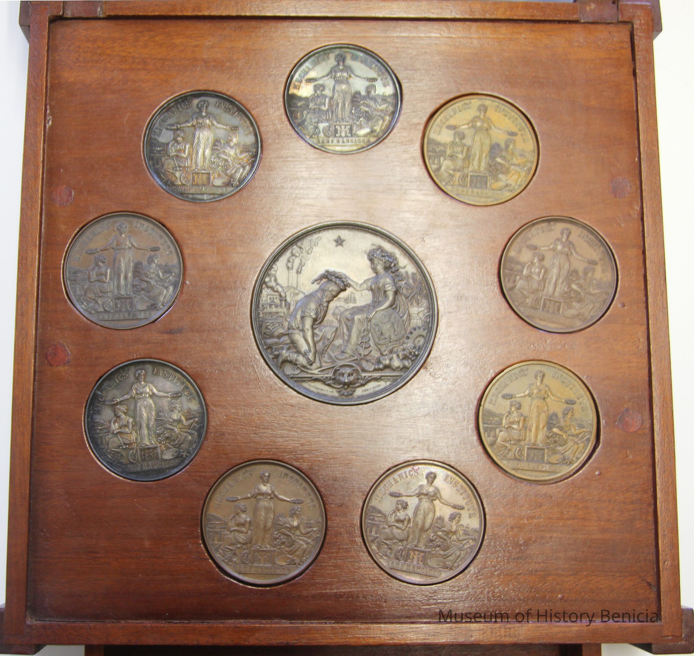 Box built by Laurence Fish to house Henrietta's medals from the Mechanics Institute. It is made of wood and has a fish carved on top. There are 10 circular spaces inside to house each of the medals that Henrietta won for various artistic accomplishments.