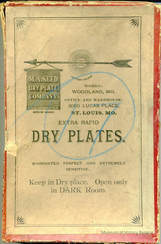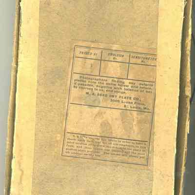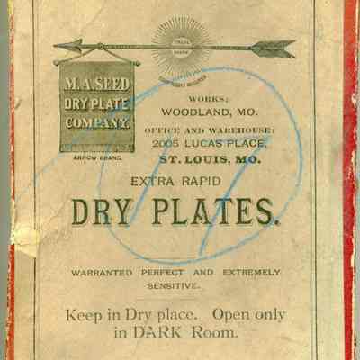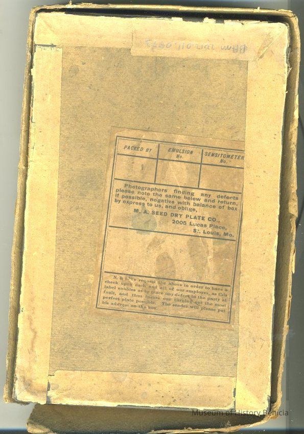 Cardboard box for holding glass plates used in photography. The box is 5.5 x 8.5" and probably held 12 5 x 8 Dry Plate glass negatives. The manufacturer was M.A. Seed Company of Woodland, Mo. There is a number written on the outside "17".Collection