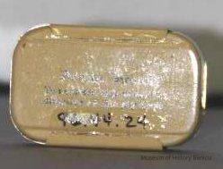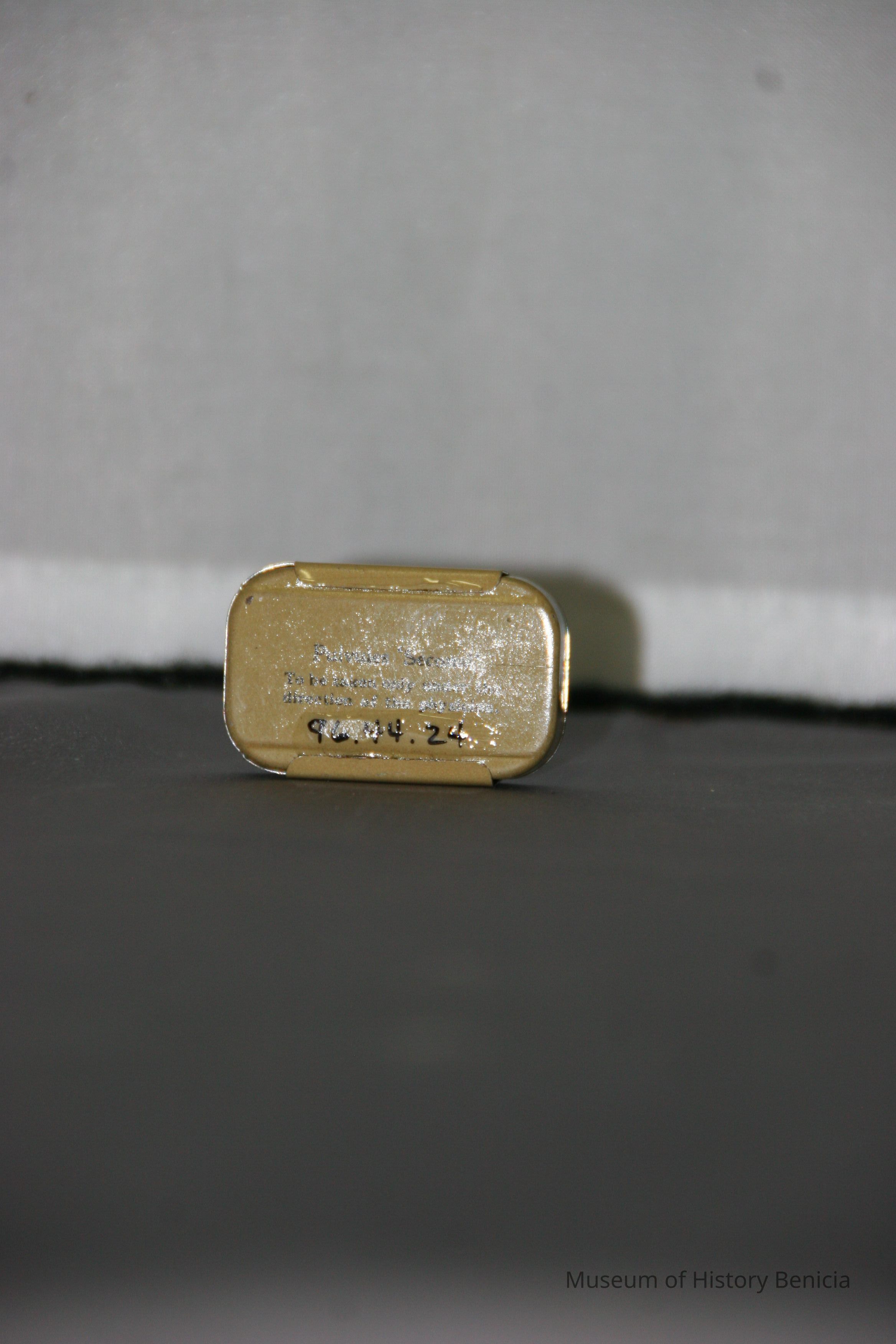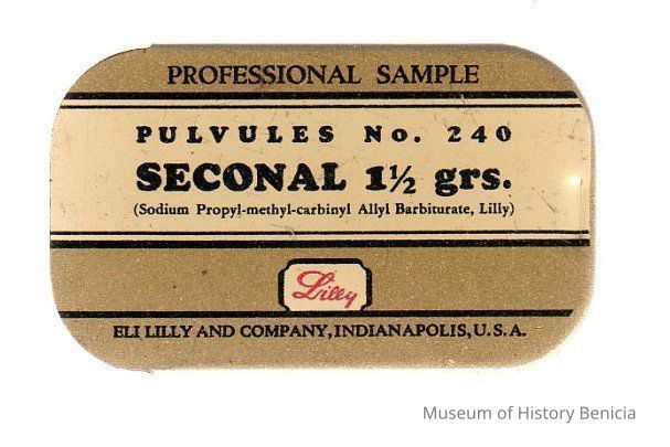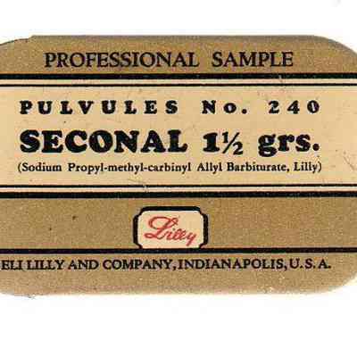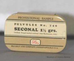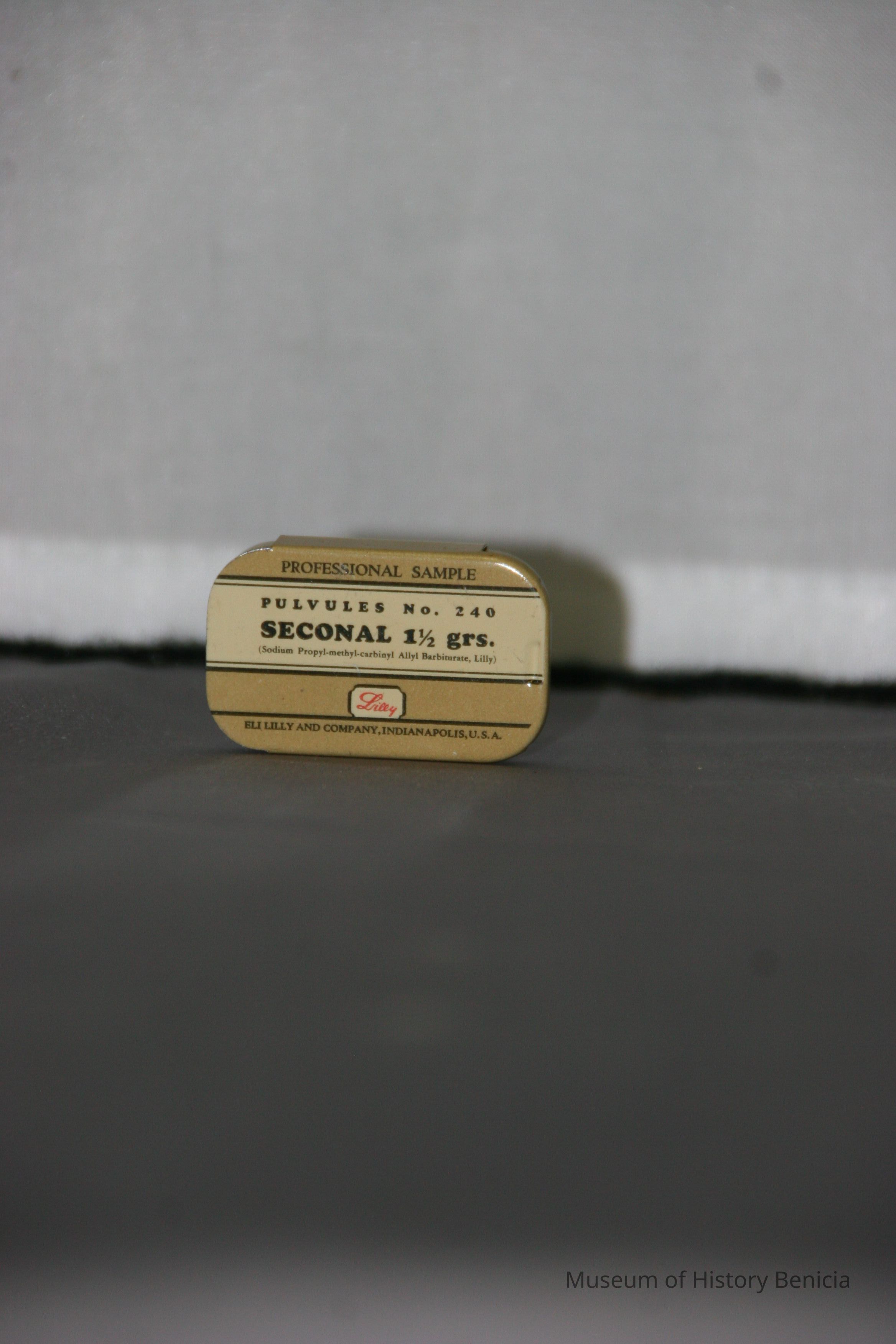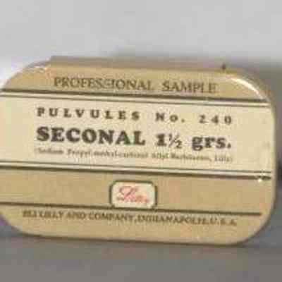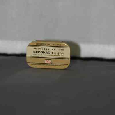metal pill tin - two part bottom with slide on lid; black ink on cream and tan background directly on the metal; "Professional Sample" "Pulvules No. 240 Seconal 1-1/2 grs."