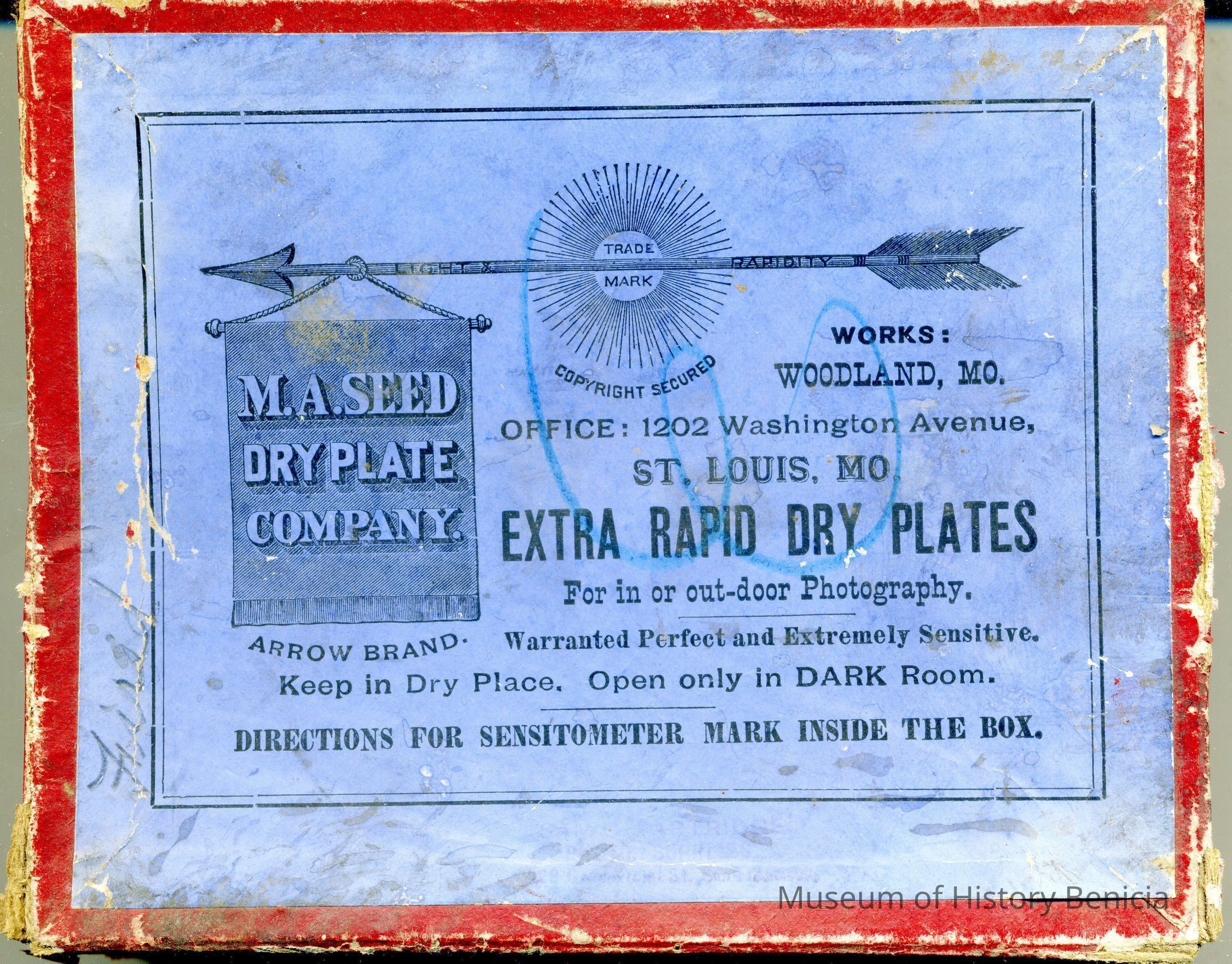 Cardboard box for holding glass plates used in photography. The box is 5.5 x 4.5" and held 12 4 x 5 Dry Plate glass negatives. The manufacturer was M.A. Seed Company of Woodland, Mo. There is a number written on the outside "3". Inside are no yellow tissues used to separate the plates.Collection