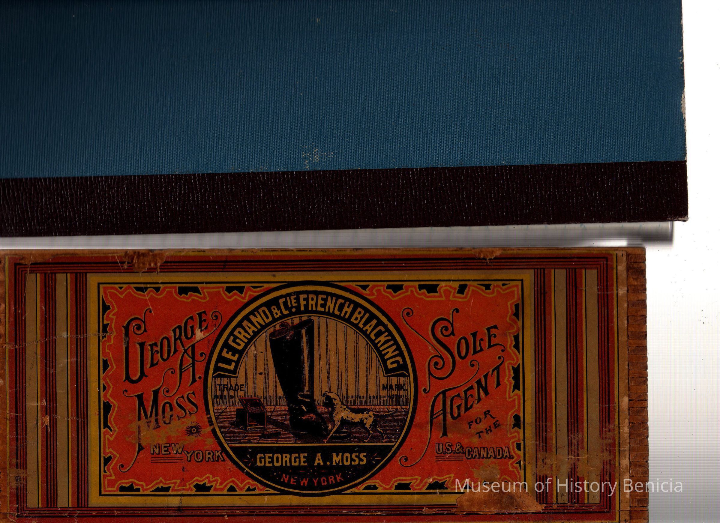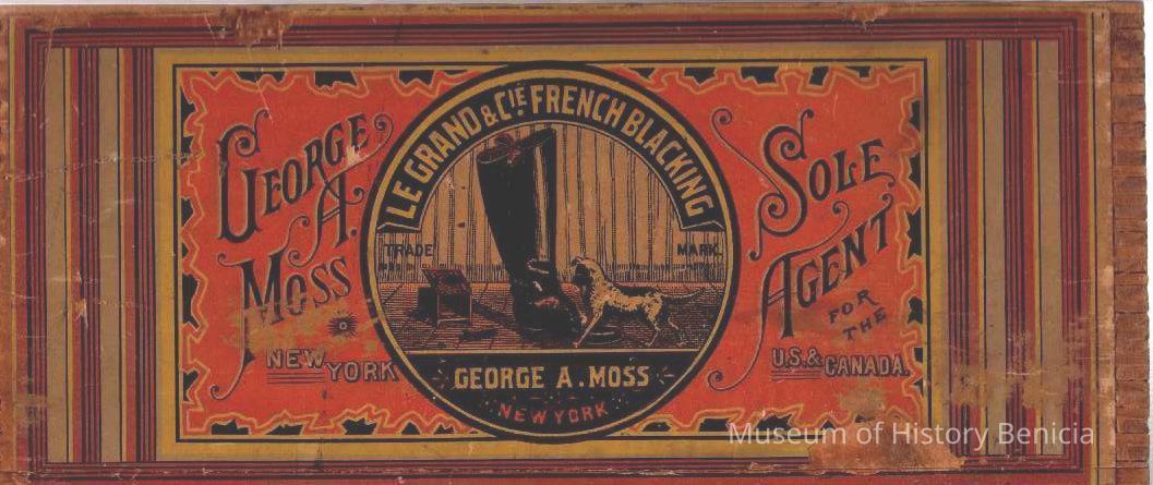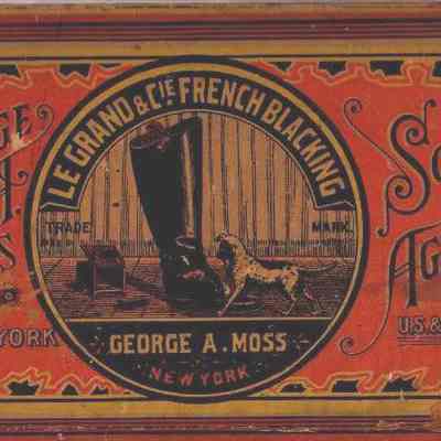 the box was used to ship containers of LeGrand & Cie French Blacking by George A. Moss, New York. The label states "Sole Agent for the U.S. & Canada." The trade mark drawing on the label shows a shoe shine kit, a large boot and a small white w/black spots dog. The label is only on one side and there is no lid on the boxCollection