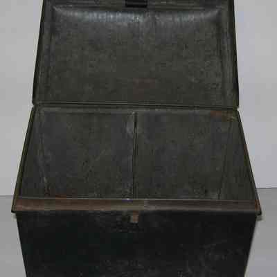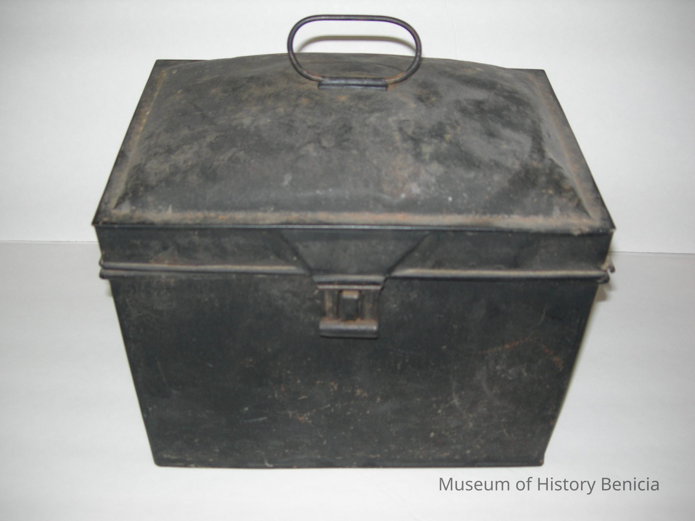 metal box, use unknown; appears to have been divided into two sections originally; hinged lide with handle on top; hasp and loop to hold a lock; black; lots of rust and dirtCollection