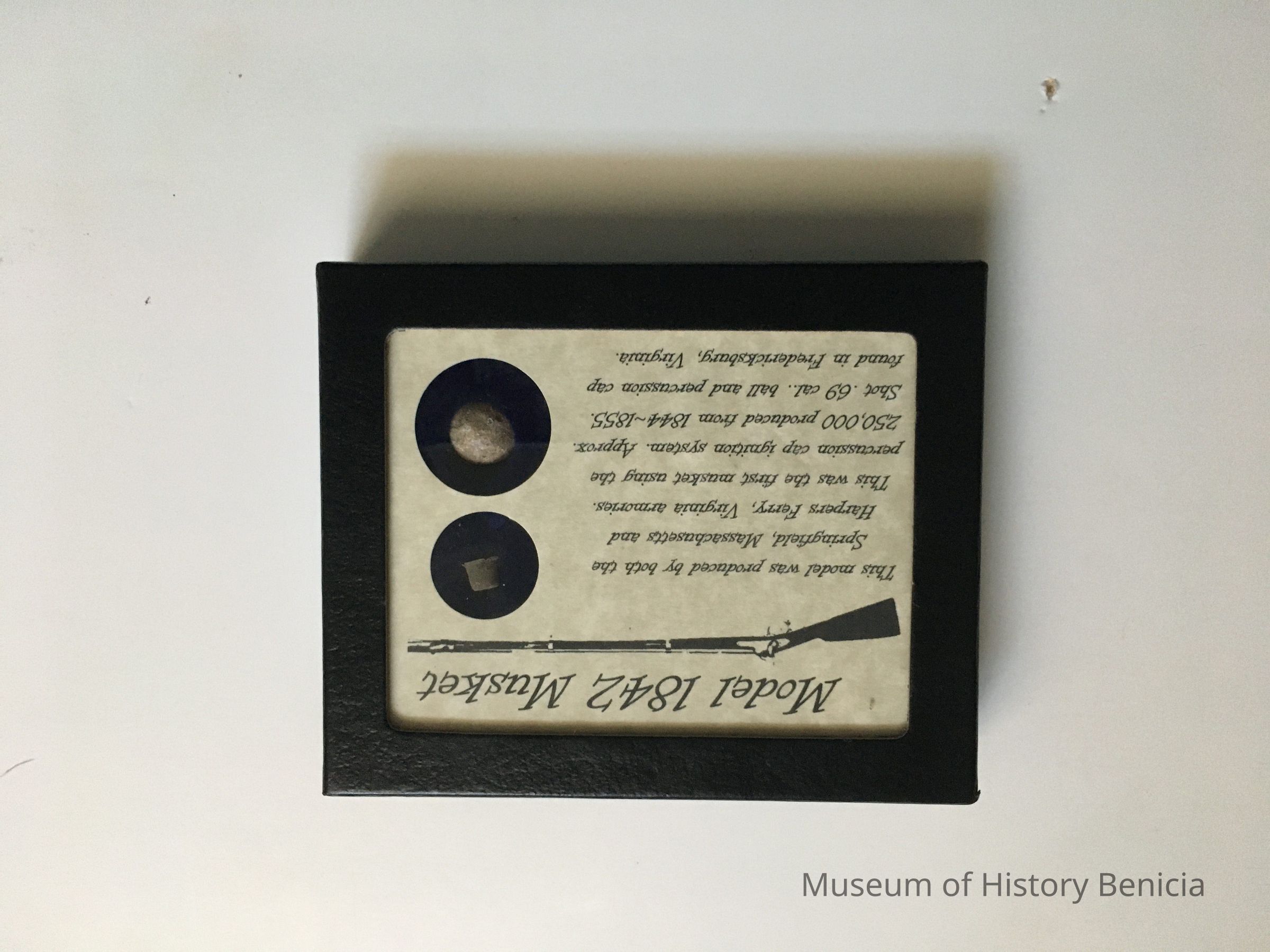 Display box, 4 1/2" by 5 1/2", with cap and mini ball for 1842 Springfield musket.