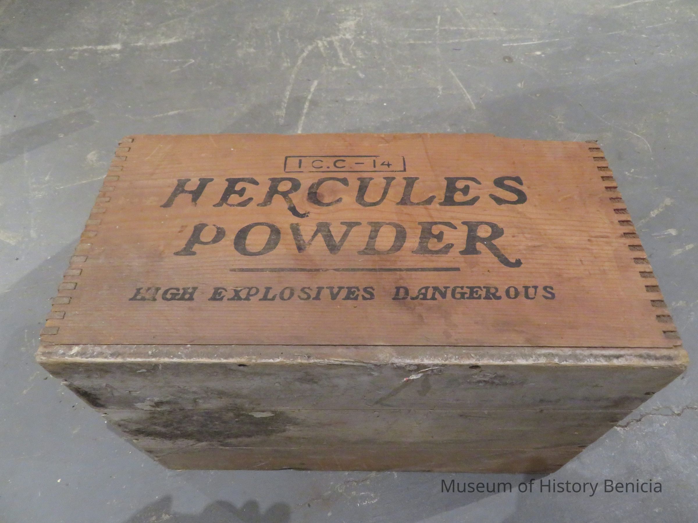 Wooden box with dove tail corners "Hercules Powder High Explosive Dangerous" on the 2 long sides. Very faded verbage on short sides. Inside there is an assortment of tool attachments.Collection