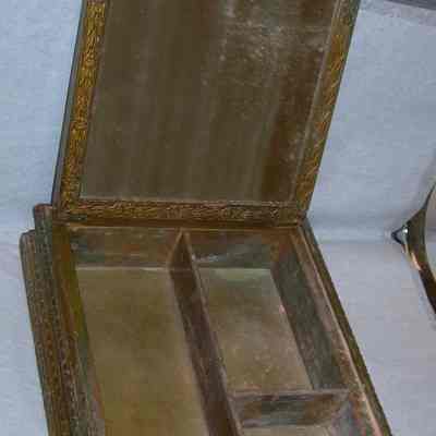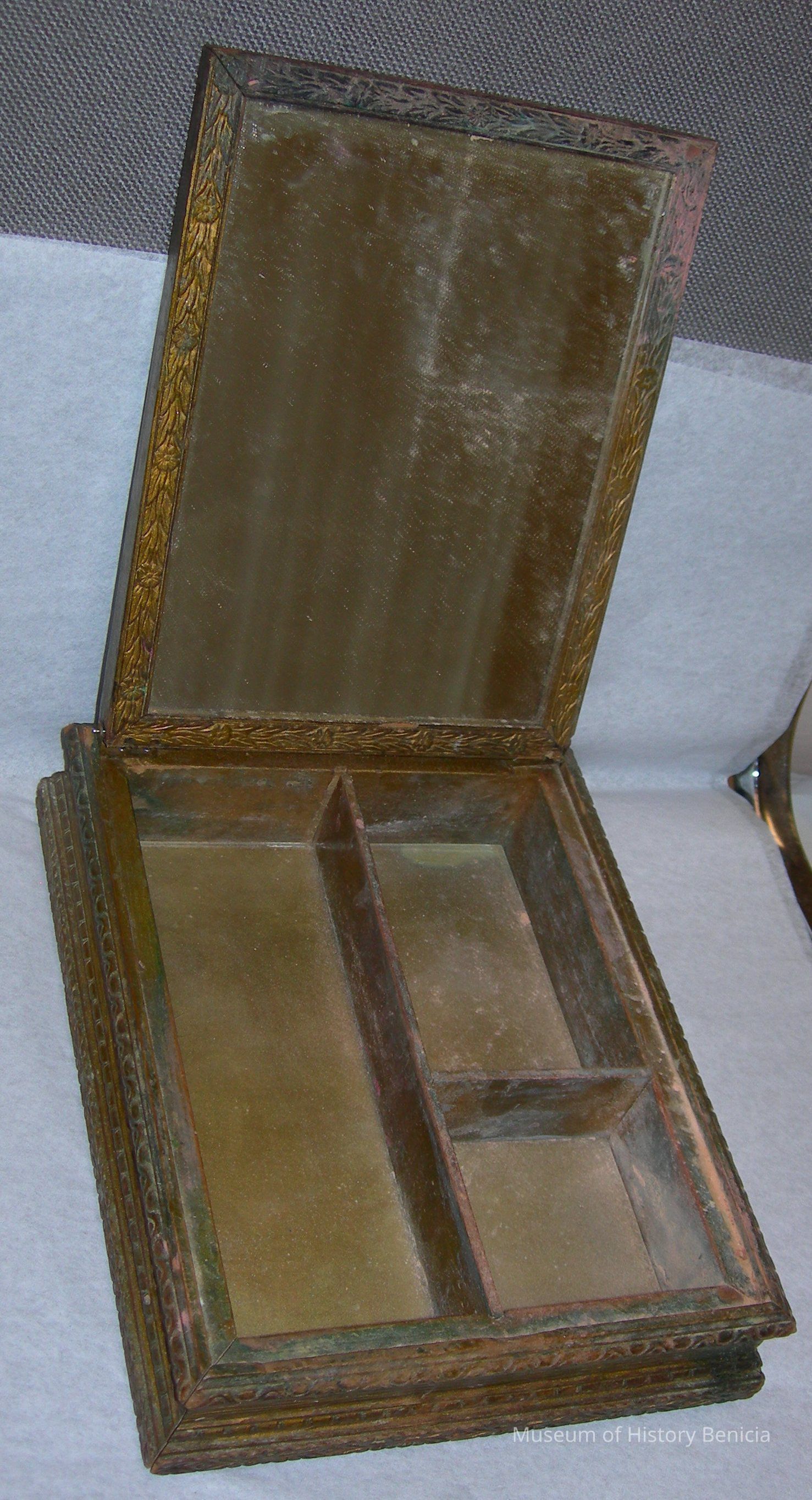 lid lifts to expose a mirror on the inside of the lid and three compartments with glass on bottom and wood dividers; gray felt on bottonCollection