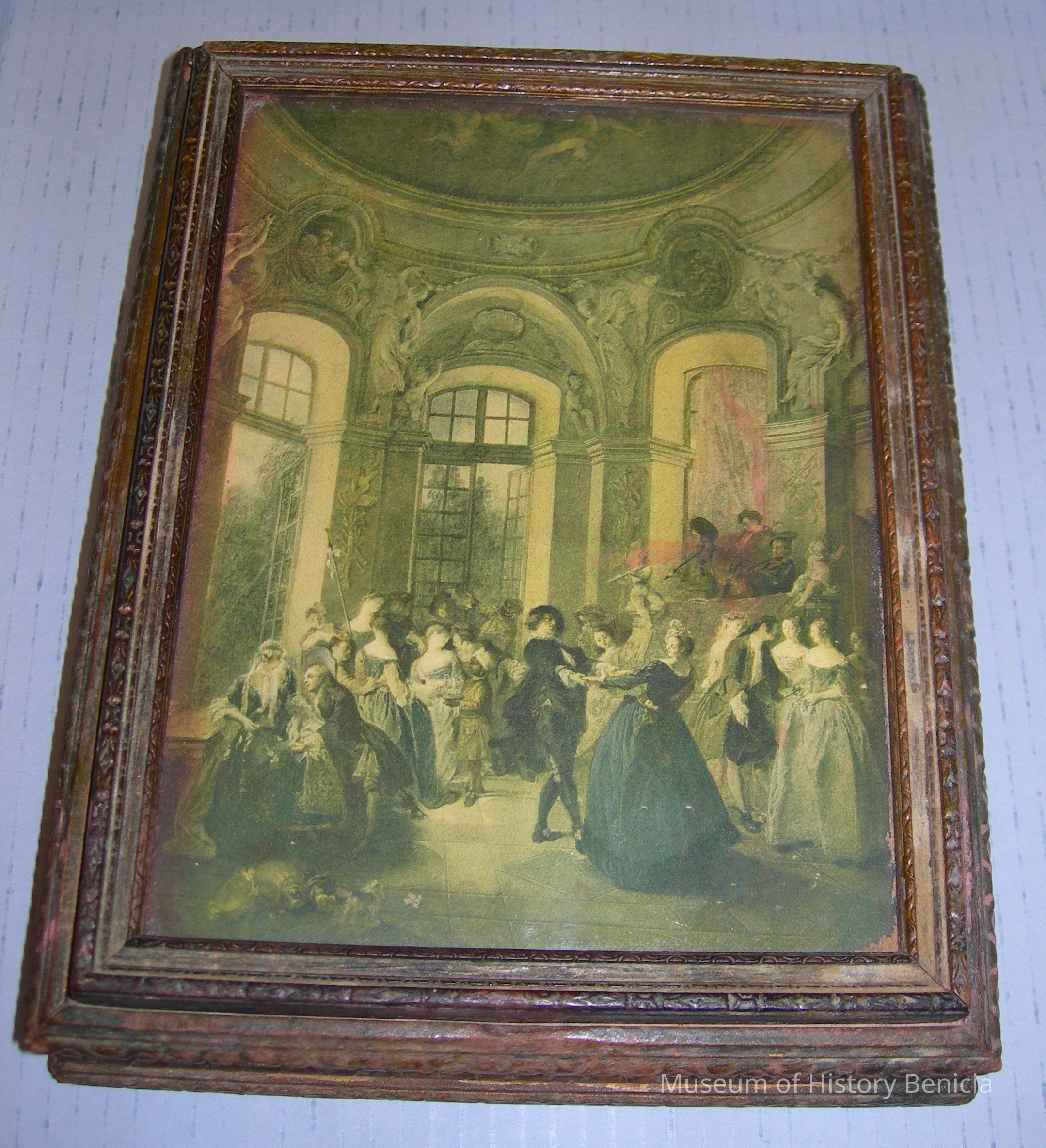 Carved wood make-up box with old-fashioned drawing/print on top of dancers in an ornate setting;