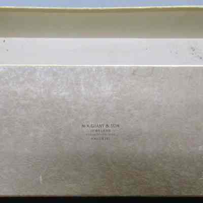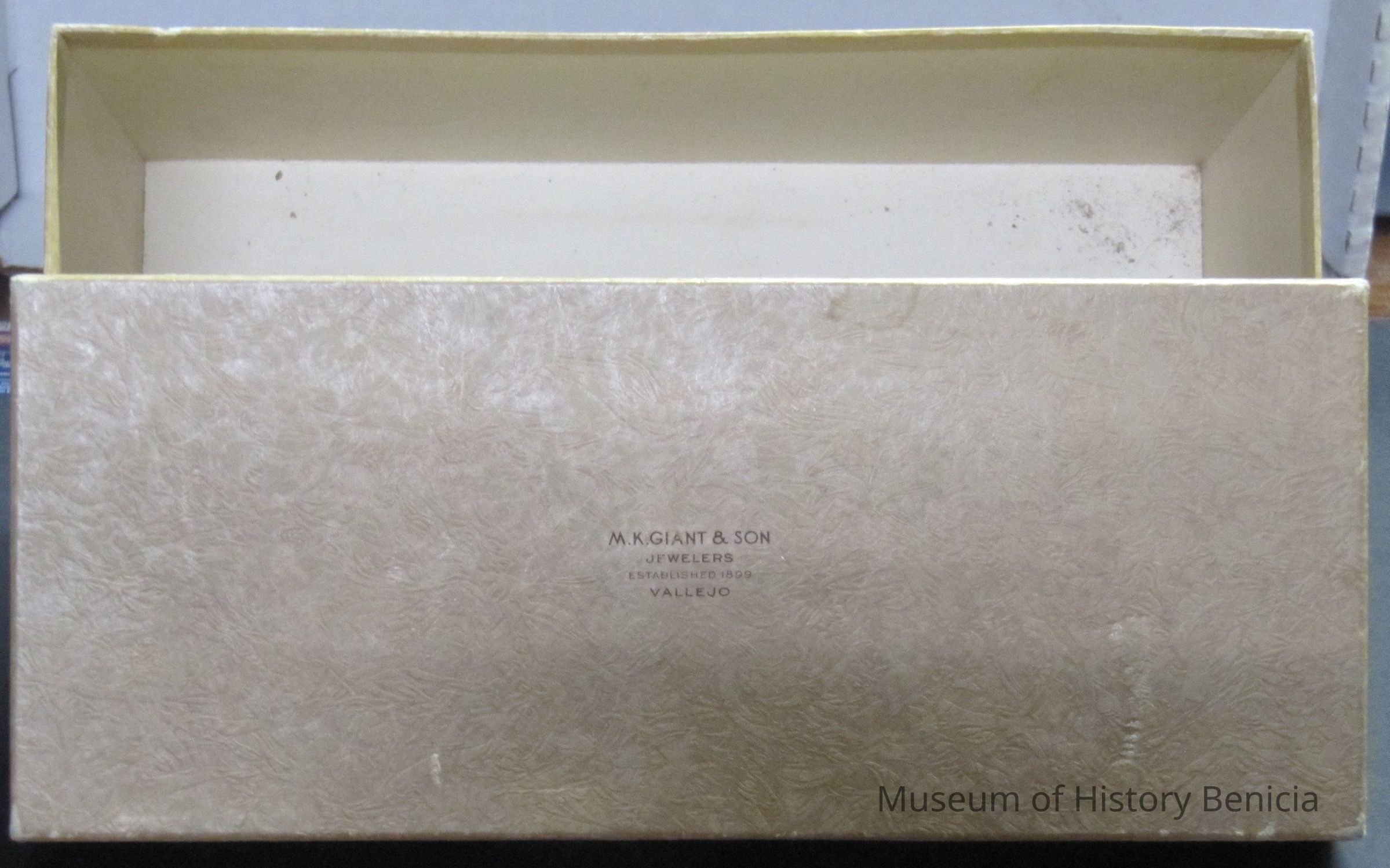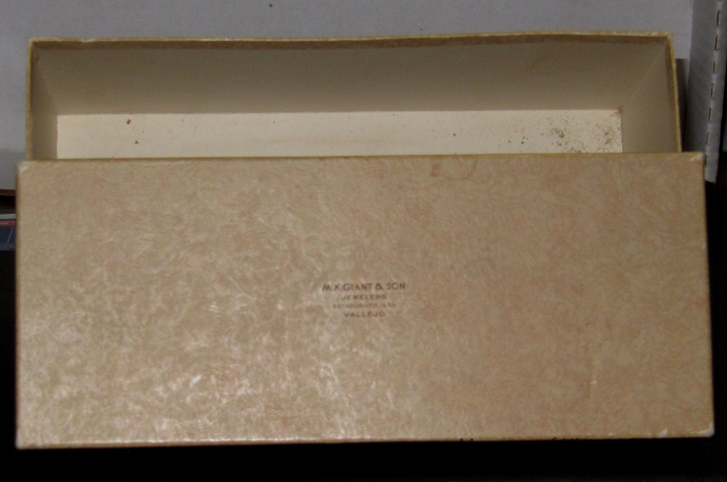 This is a box from the M.K. Giant & son jewelers in Vallejo. It is brown and measures 10" x 3.75" x 3.25"
