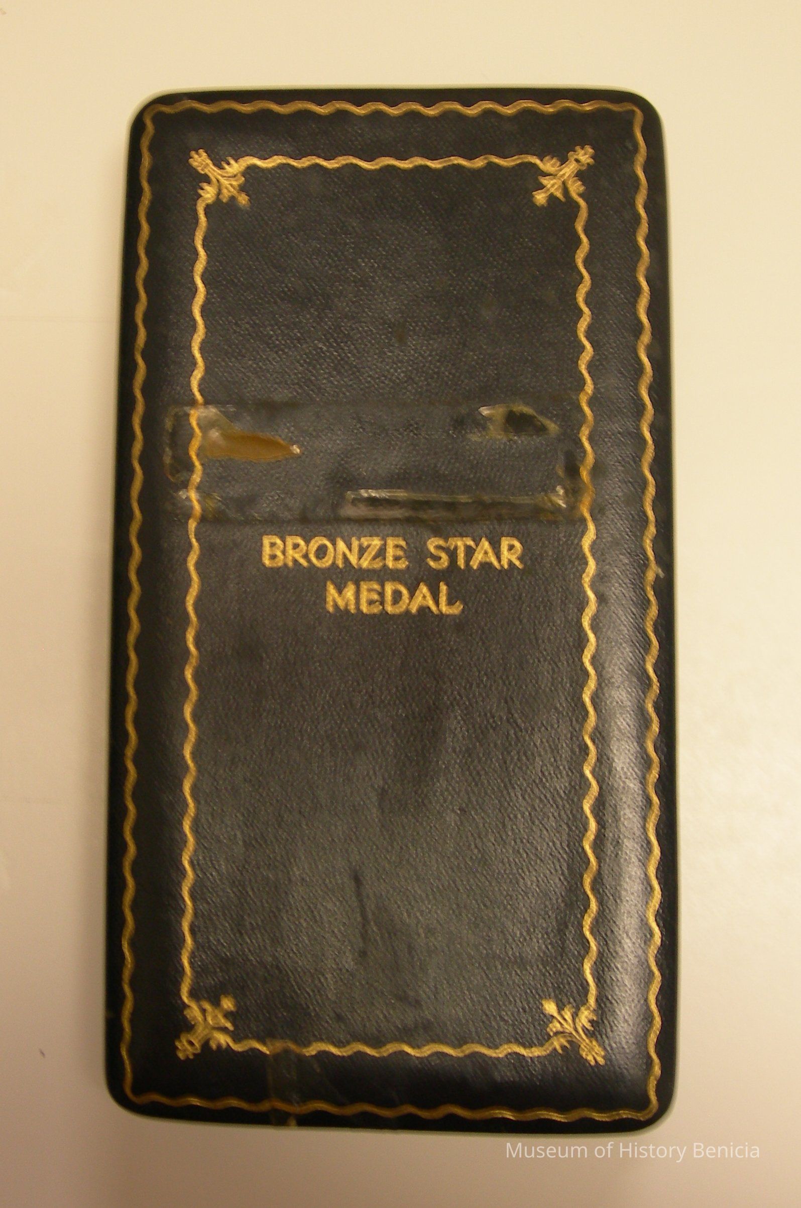 Black box with hinge lid; outside cover: "Bronze Star Medal" in gold with double scalloped edging also in gold; 3-1/2" wide x 6-1/2" high x 1" deep; soft beige lining on inside.Collection