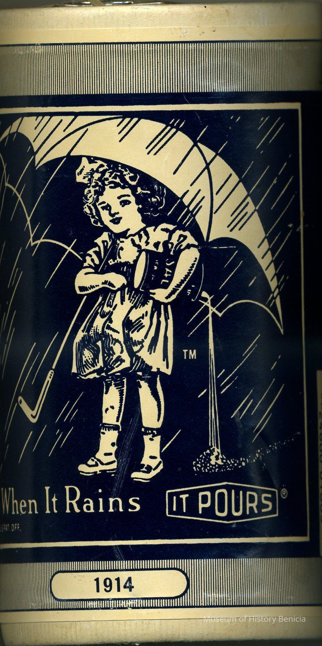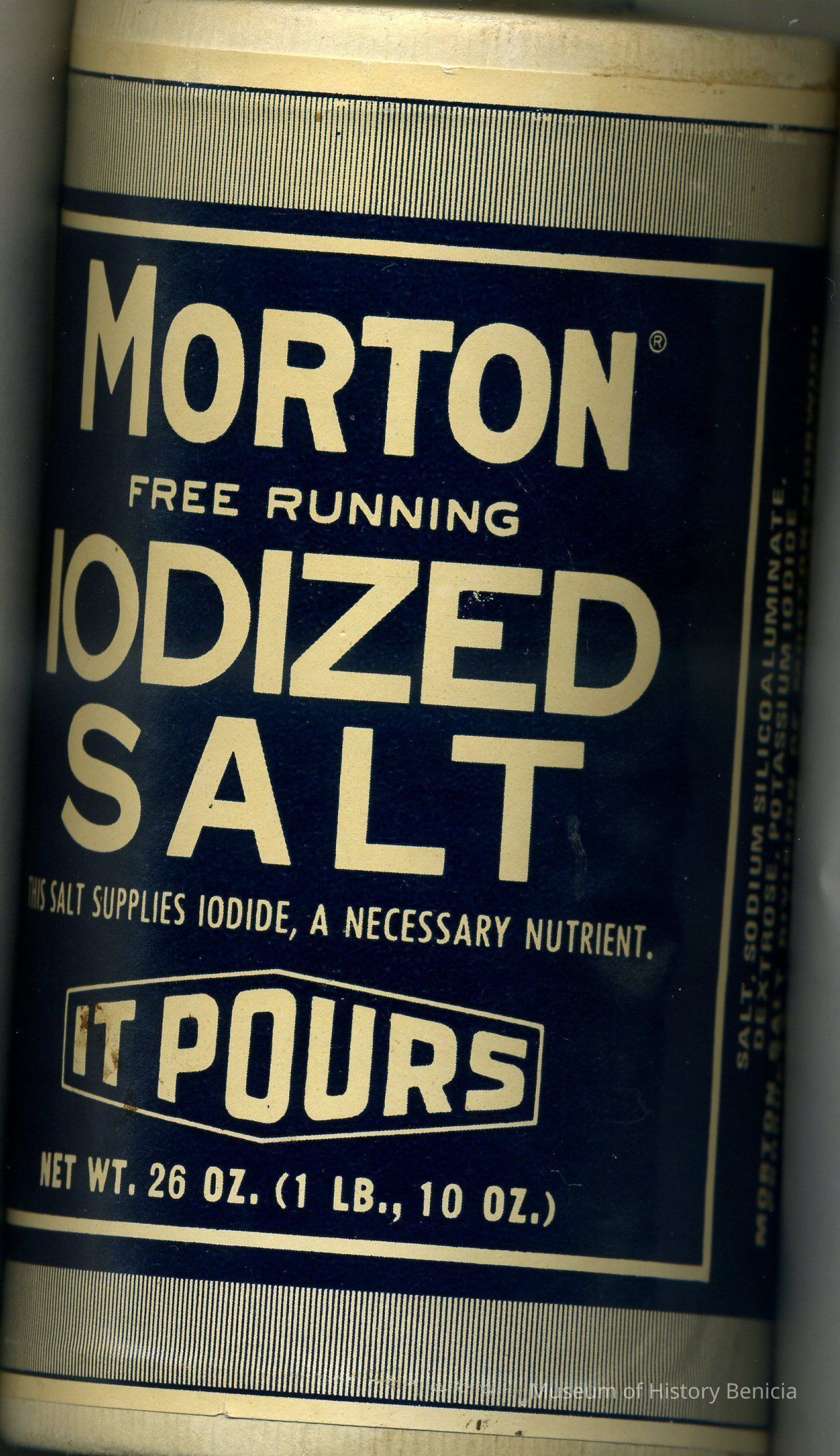 Container - reproduction of round Morton Iodized Salt Box from 1914 (has a bar code) Blue and White 3-1/4" diameter x 5-3/8" tall