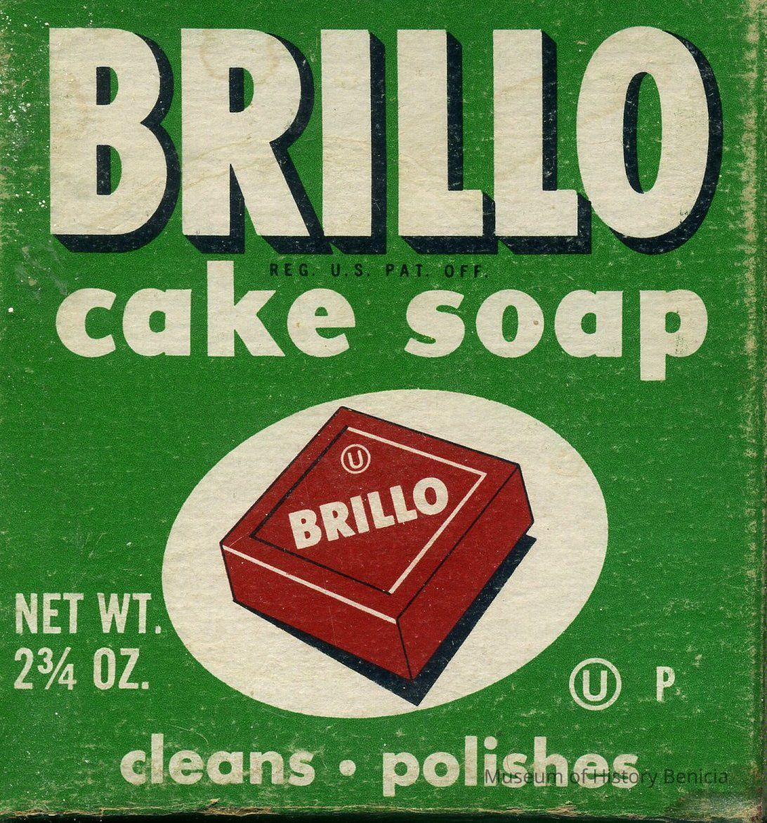 Original box for "Brillo" cake soap - "clean - polishes" on the side of the box: Brillo Cake Soap is made only from high grade vegetable oils - contains no animal fats. Rich lather gives better cleaning all around the house. For hard-to-clean utensils, save time. green/white/brown