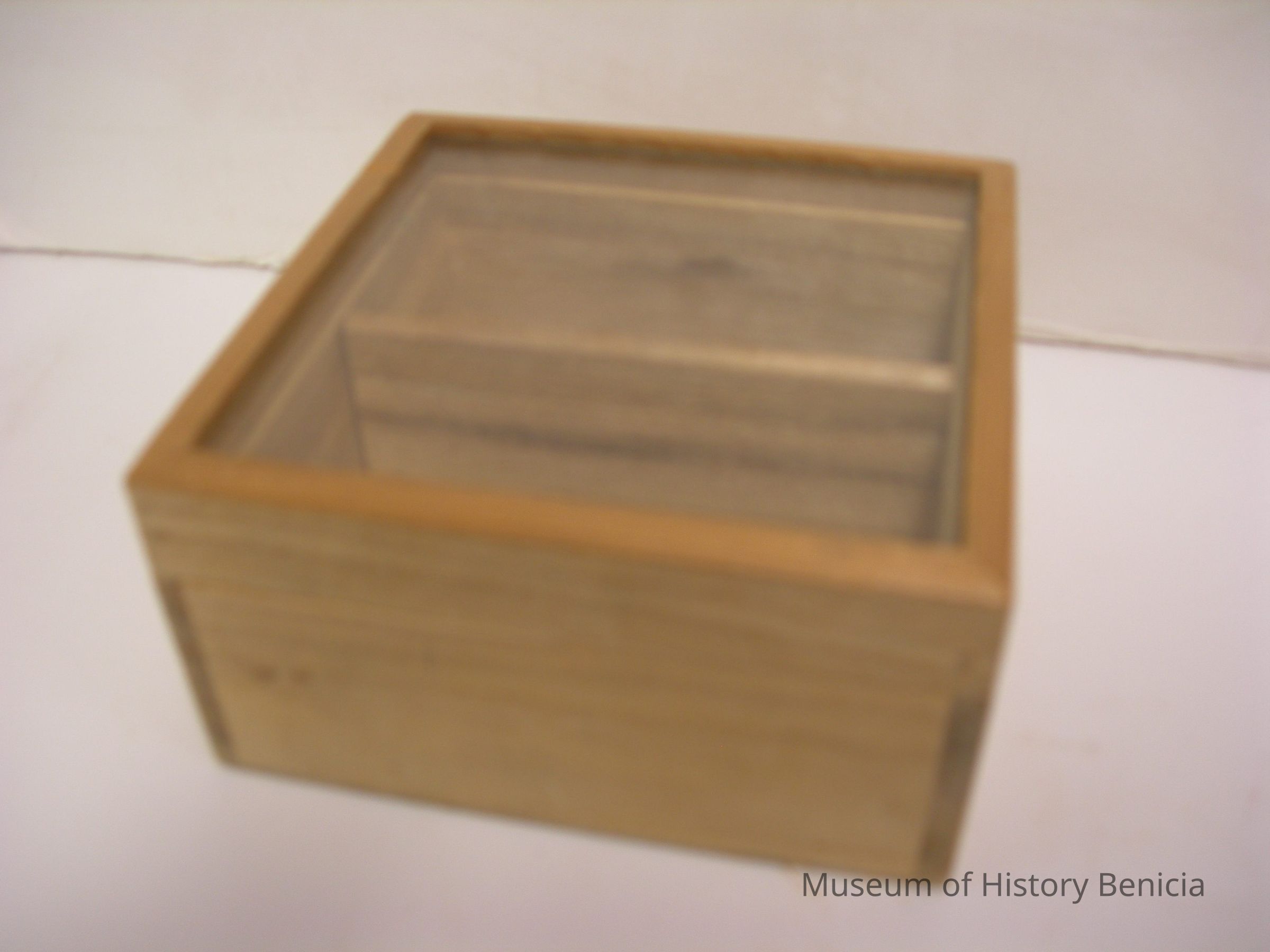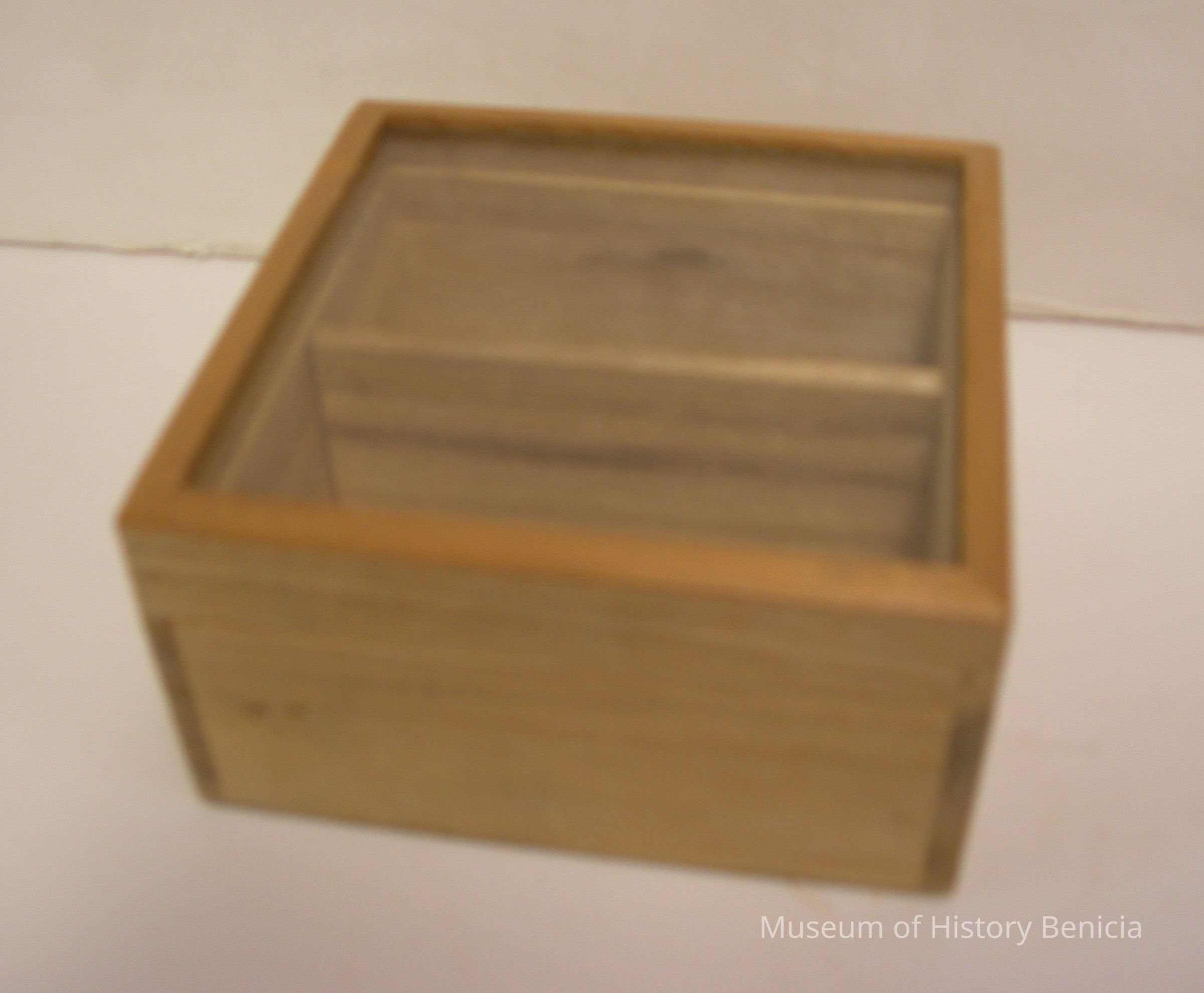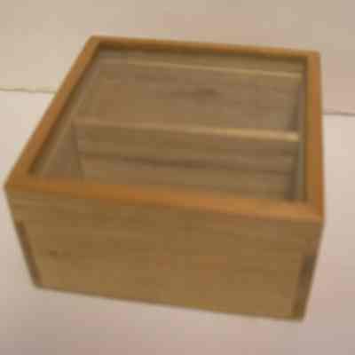 Light Brown Wooden Display Box, removable lid with glass insert to view contents; there is a thin removable piece of wood which divides the inside into two sections