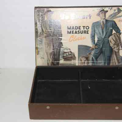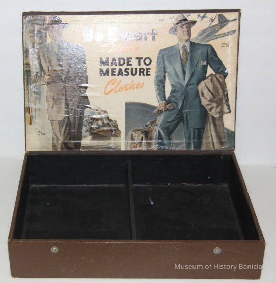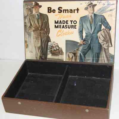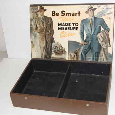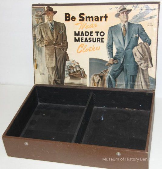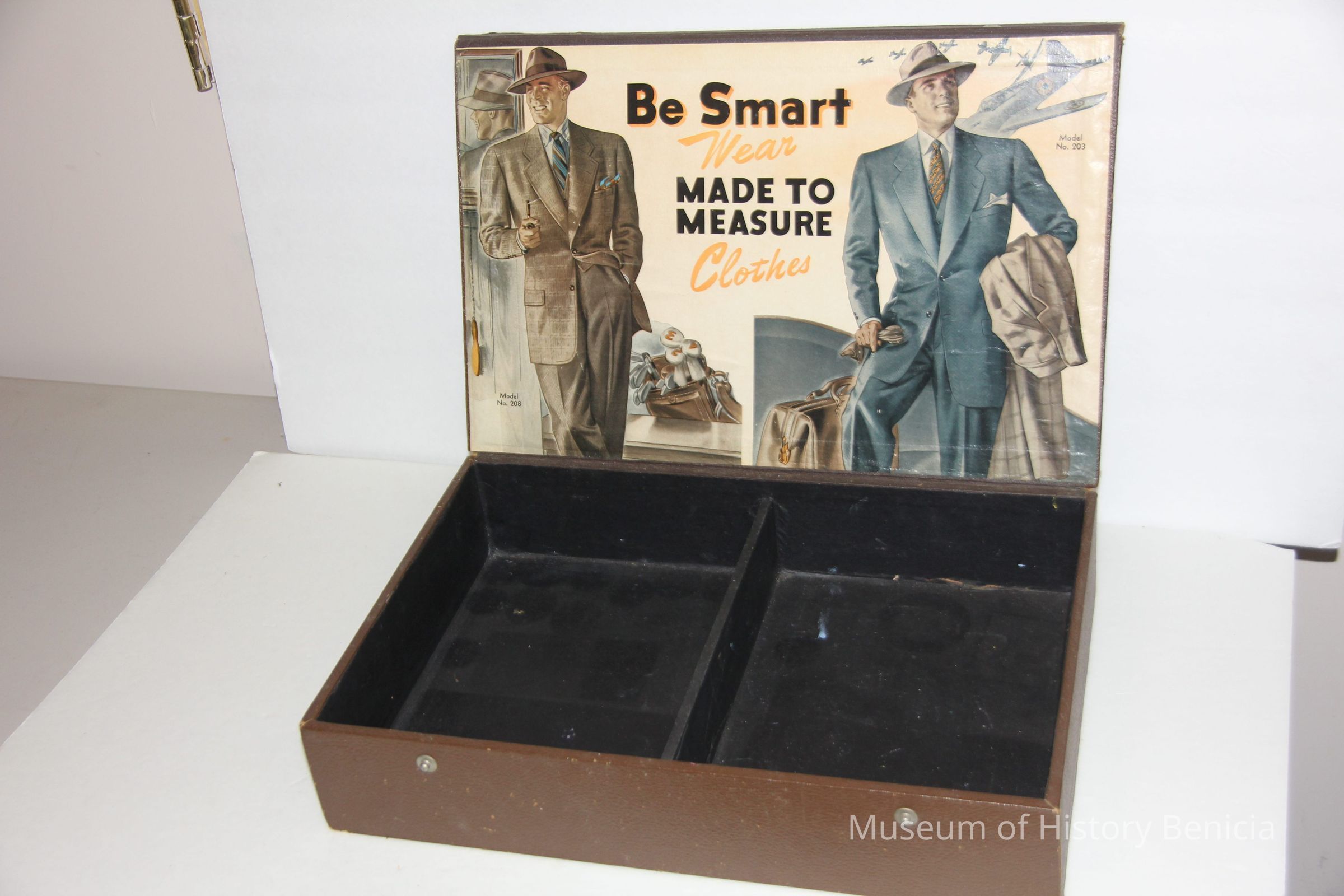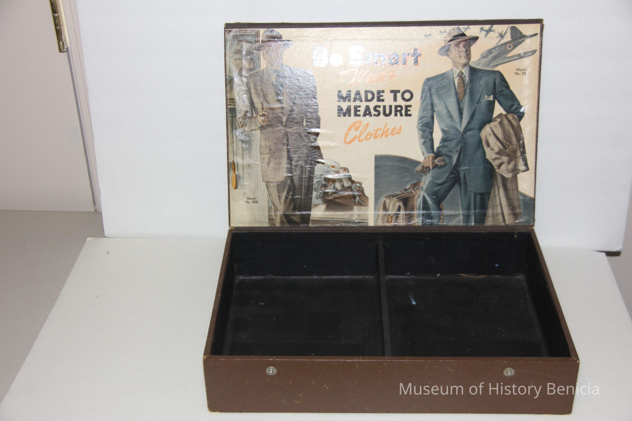 Brown fiberboard box covered by vinyl 2 button snaps to close. Divided into 2 side by side compartments. Inside cover contains illustration of two men and the slogan "Be Smart Wear Made to Measure Clothes."Collection