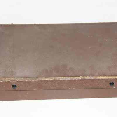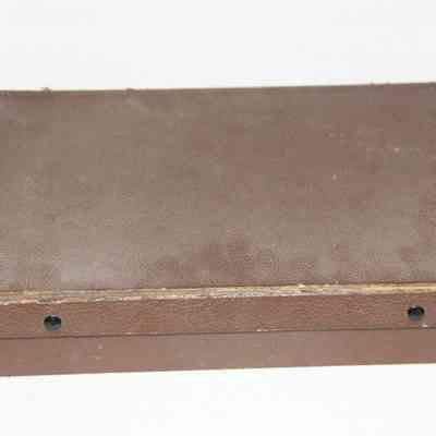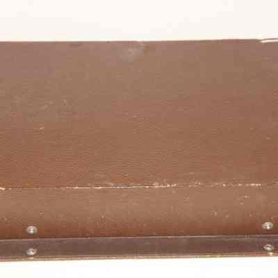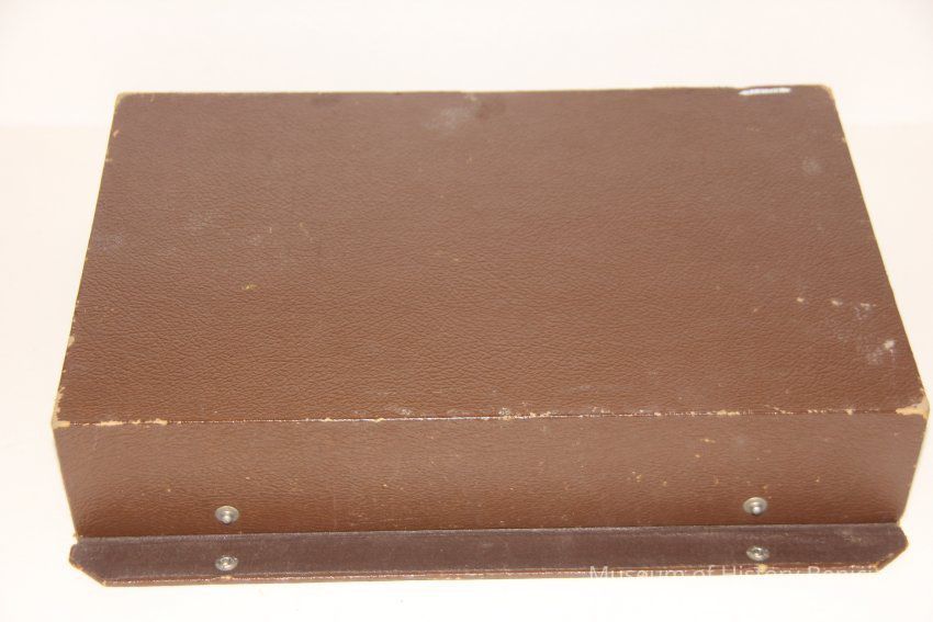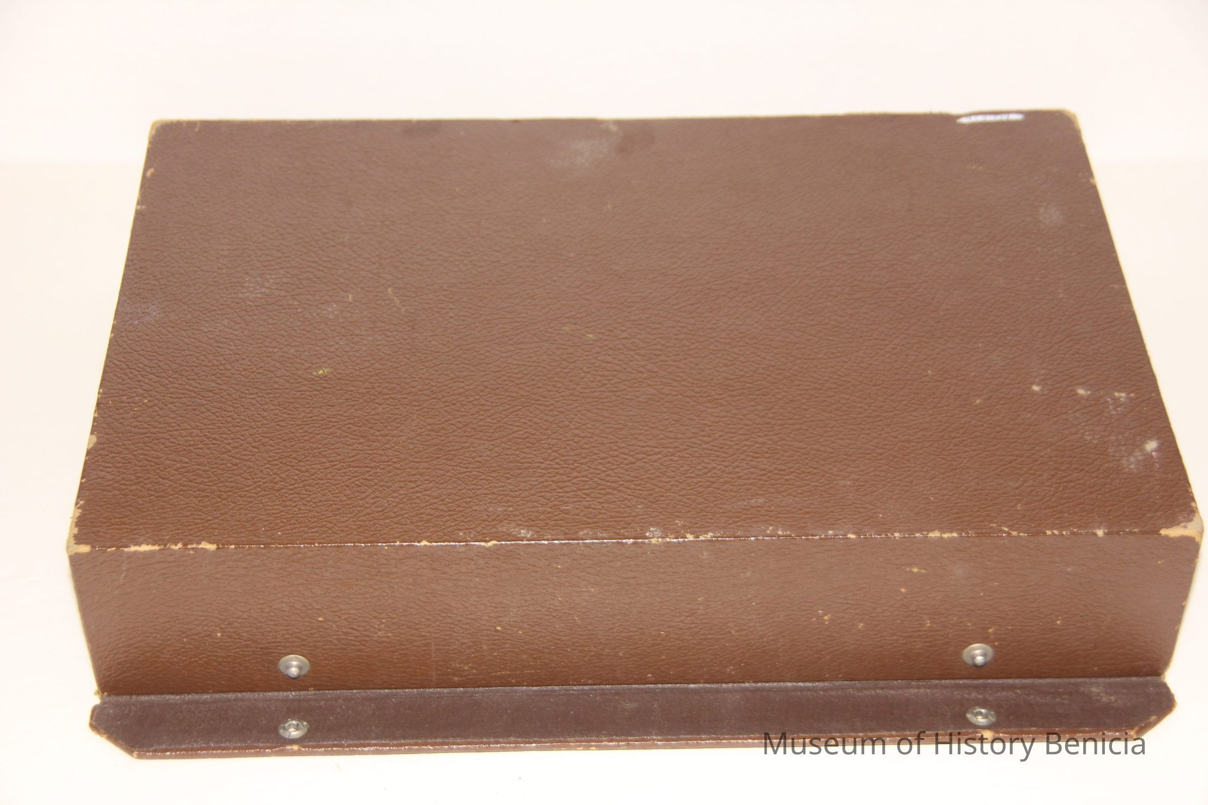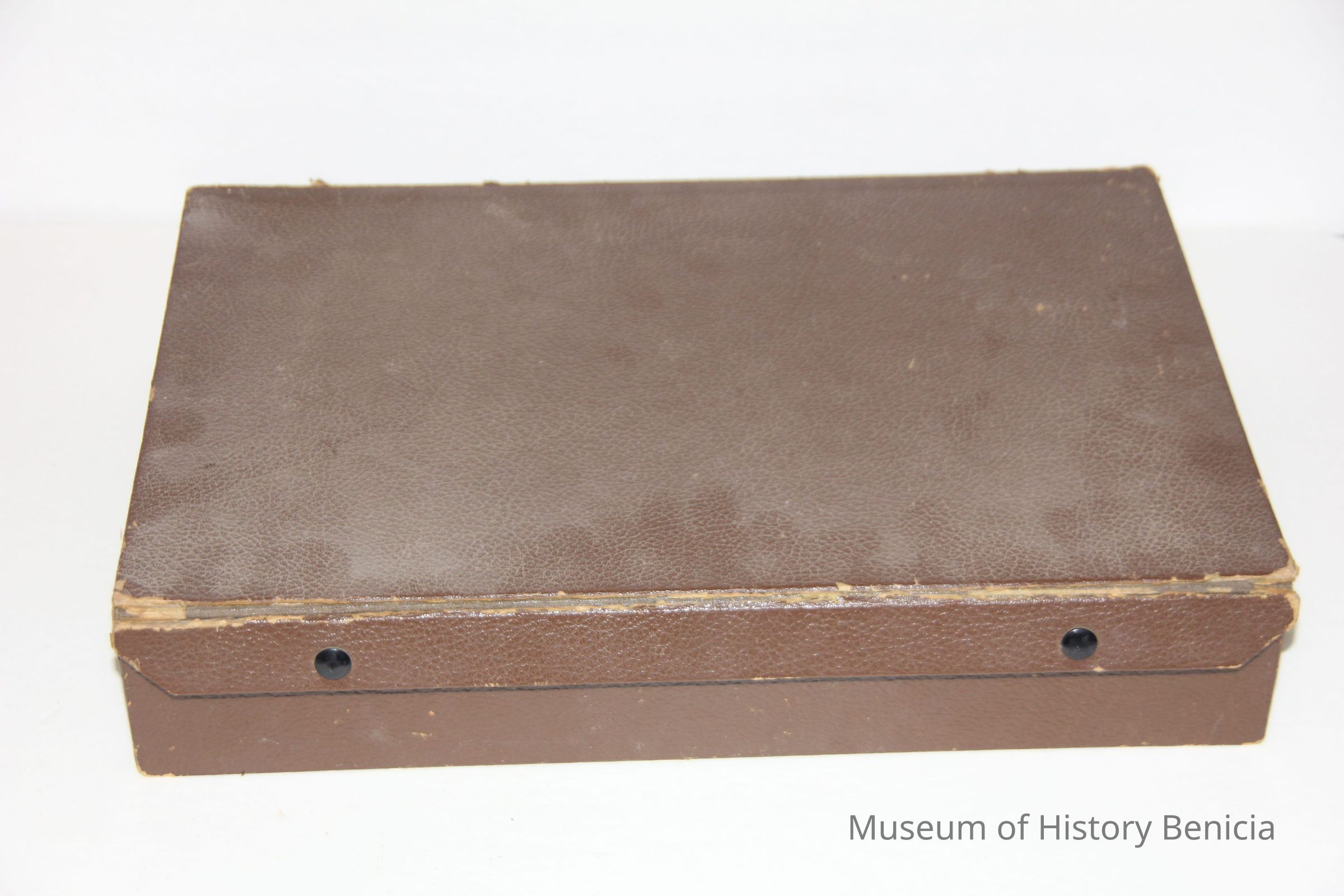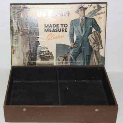 Brown fiberboard box covered by vinyl 2 button snaps to close. Divided into 2 side by side compartments. Inside cover contains illustration of two men and the slogan "Be Smart Wear Made to Measure Clothes."Collection