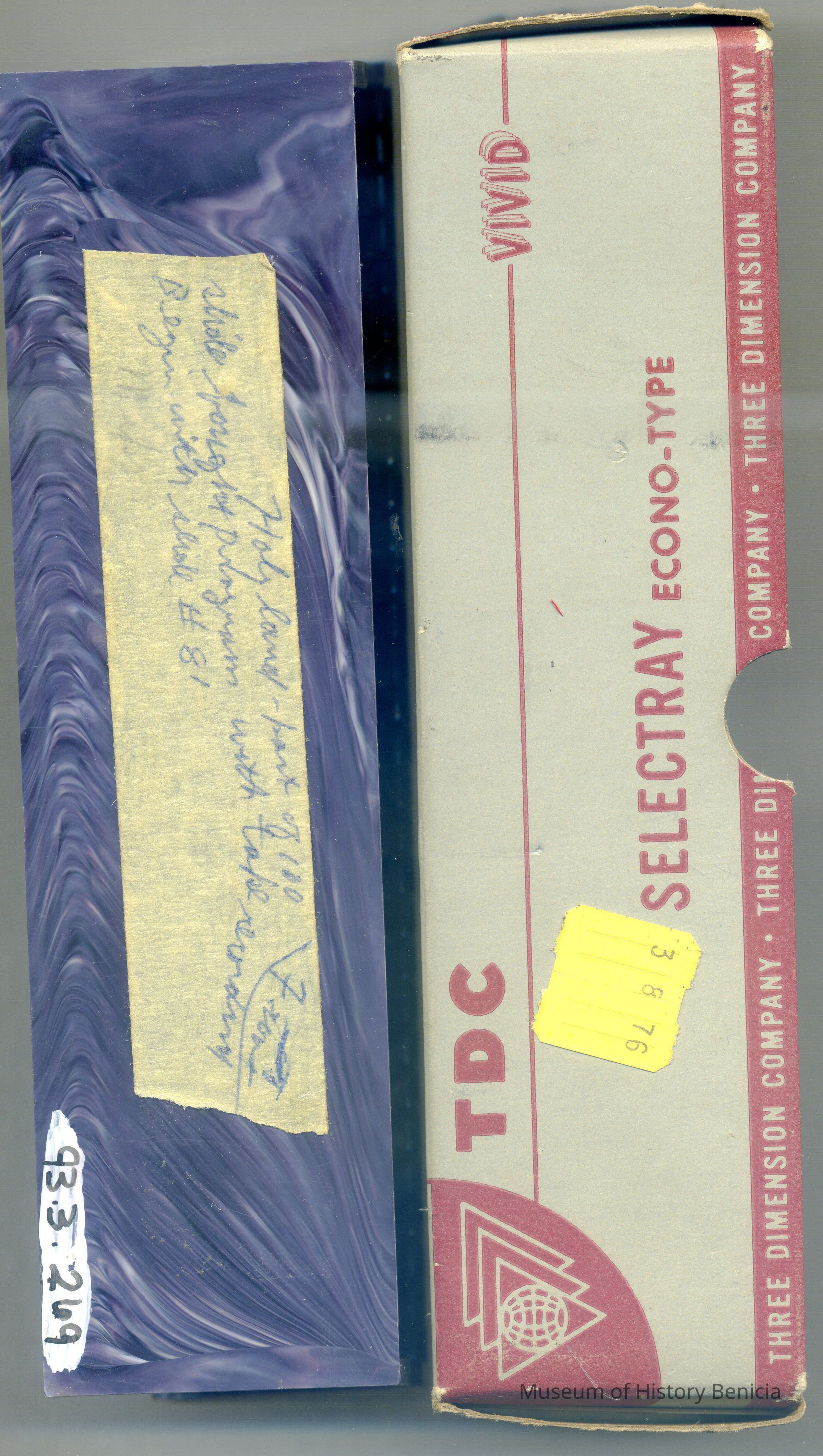 grey and white photographic slide tray in a grey and maroon ox tht reads "TDC selectray Econo-type Three Dimensional Co." Thre is writing in pencil on one side "personal" and the rest is unreadable.Collection