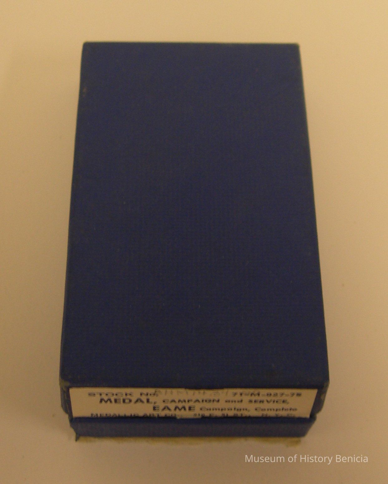 Box for Medal and Ribbon - European African Middle Eastern Campaign (EAME), Blue with white label; on box: "Medal, Campaign and Service EAME Campaign, Complete Medallic Art Co. 210 E 51 St. N.Y.C." 3-3/4" x 2-1/4" x 1/2"Collection