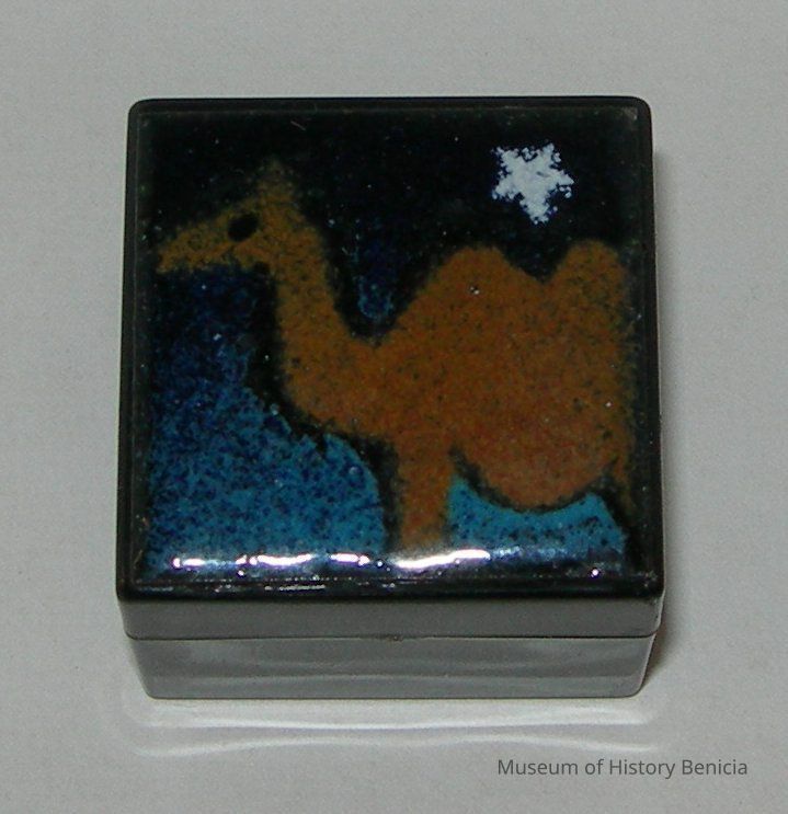 Small, square trinket box, black plastic with brown camel, white star and partial blue background on lid