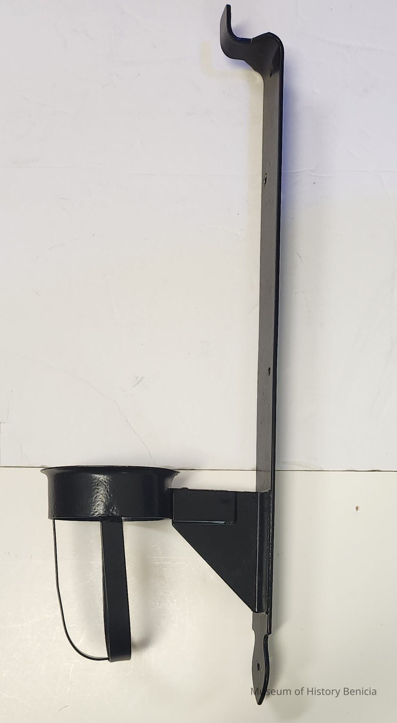 bracket to hold Conical shaped Minimax fire extinguisher, black metal with "cage" for the top of the extinguisher ito rest; four holes to attach to wall