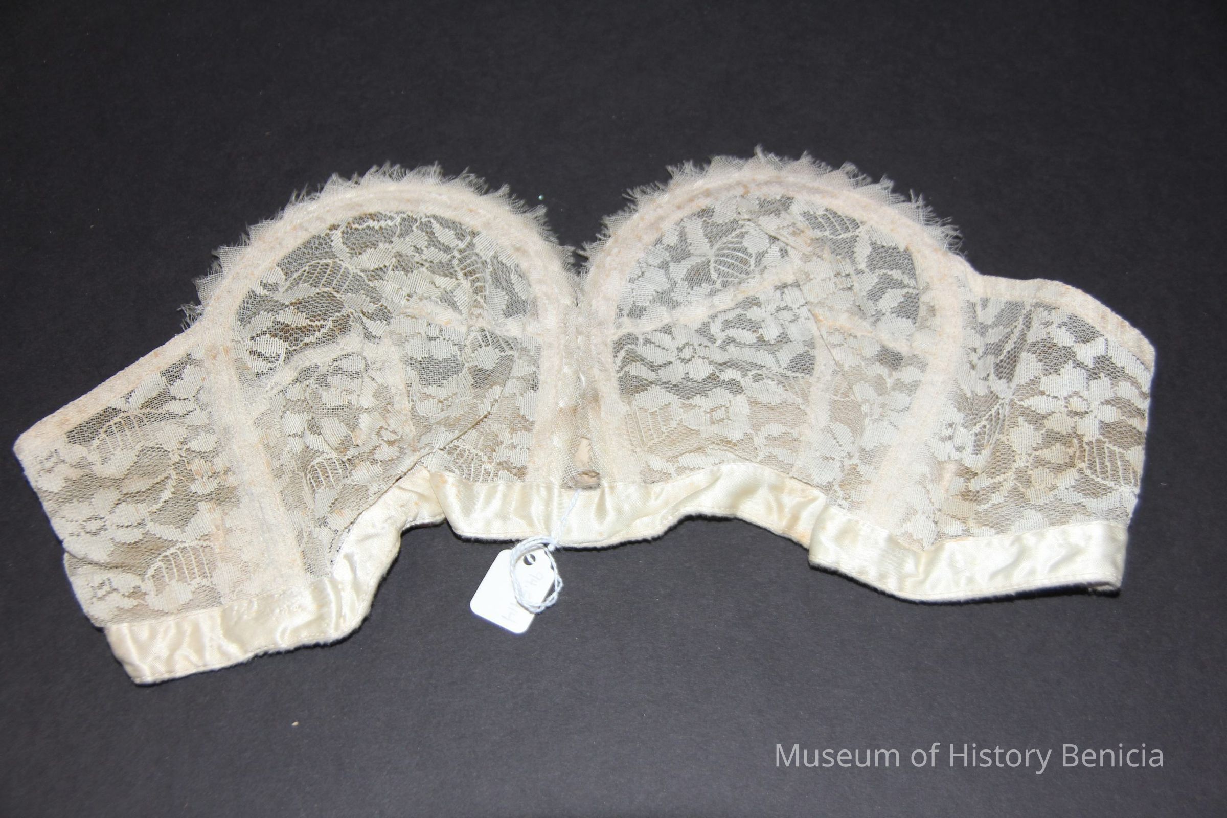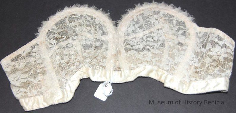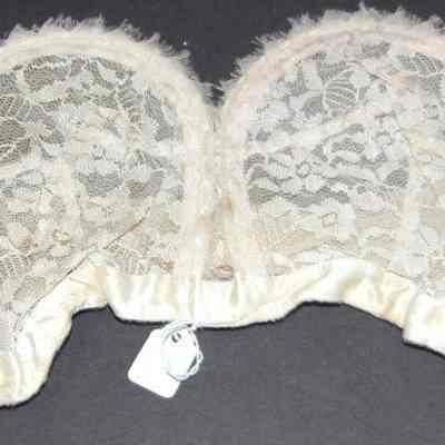 Strapless underwire bra, off-white label; Charmade/ Sears Roebuck and Co / Acetate & nylon / size 36 / 3418 Cup "A". small foam rectangular pads cover wire ends.Collection