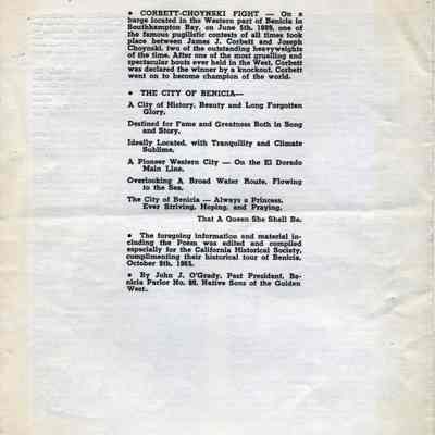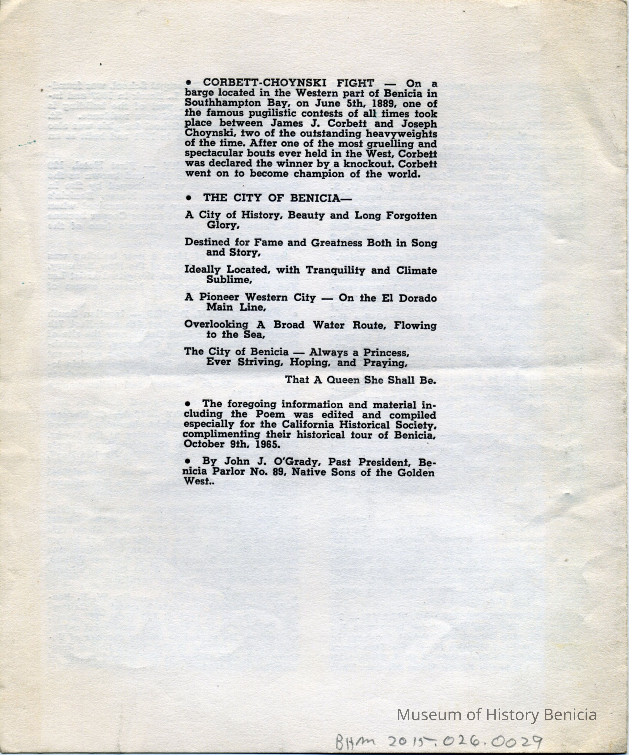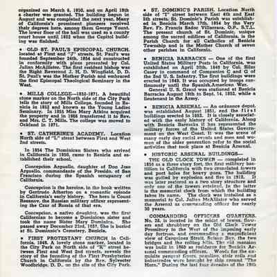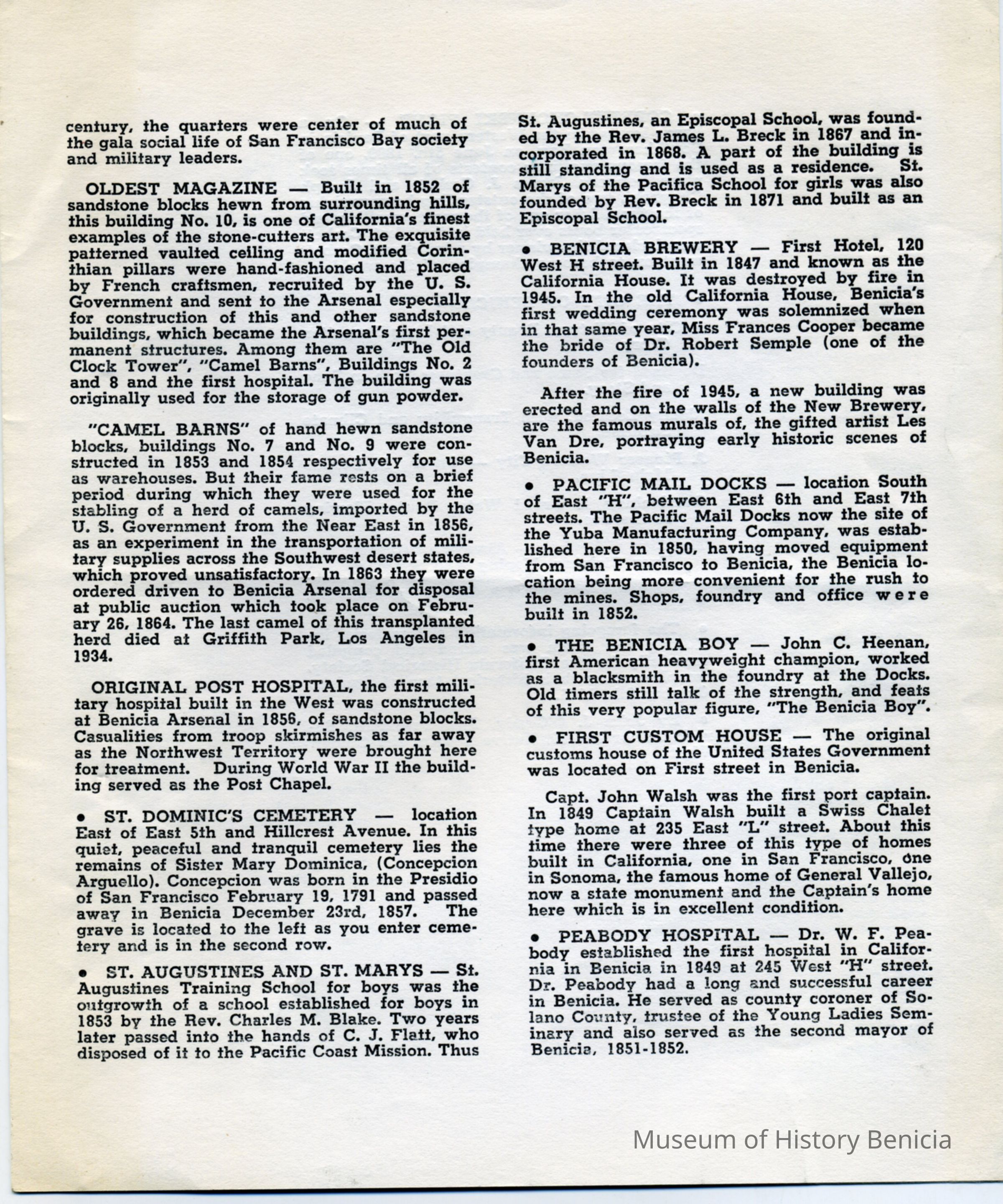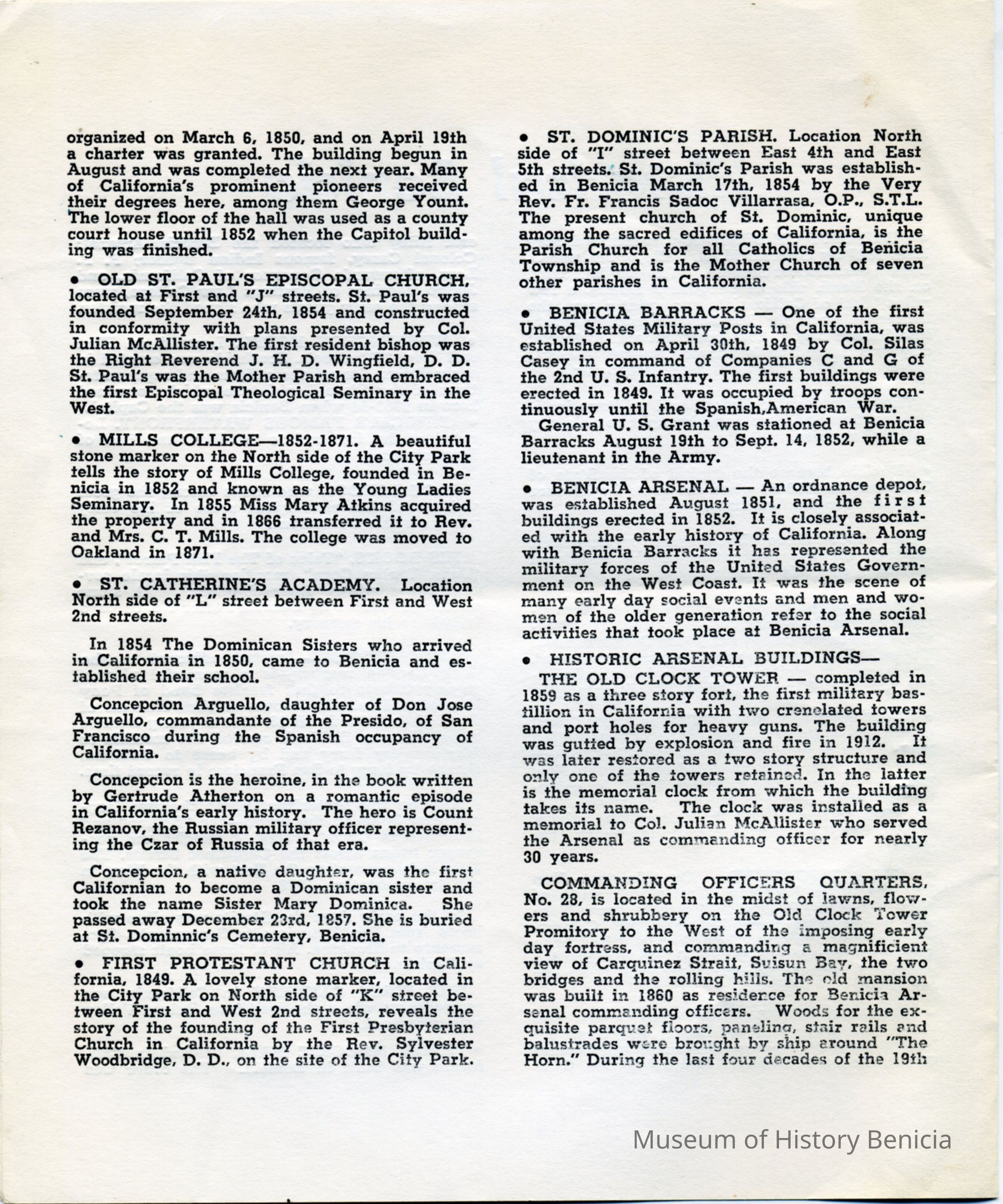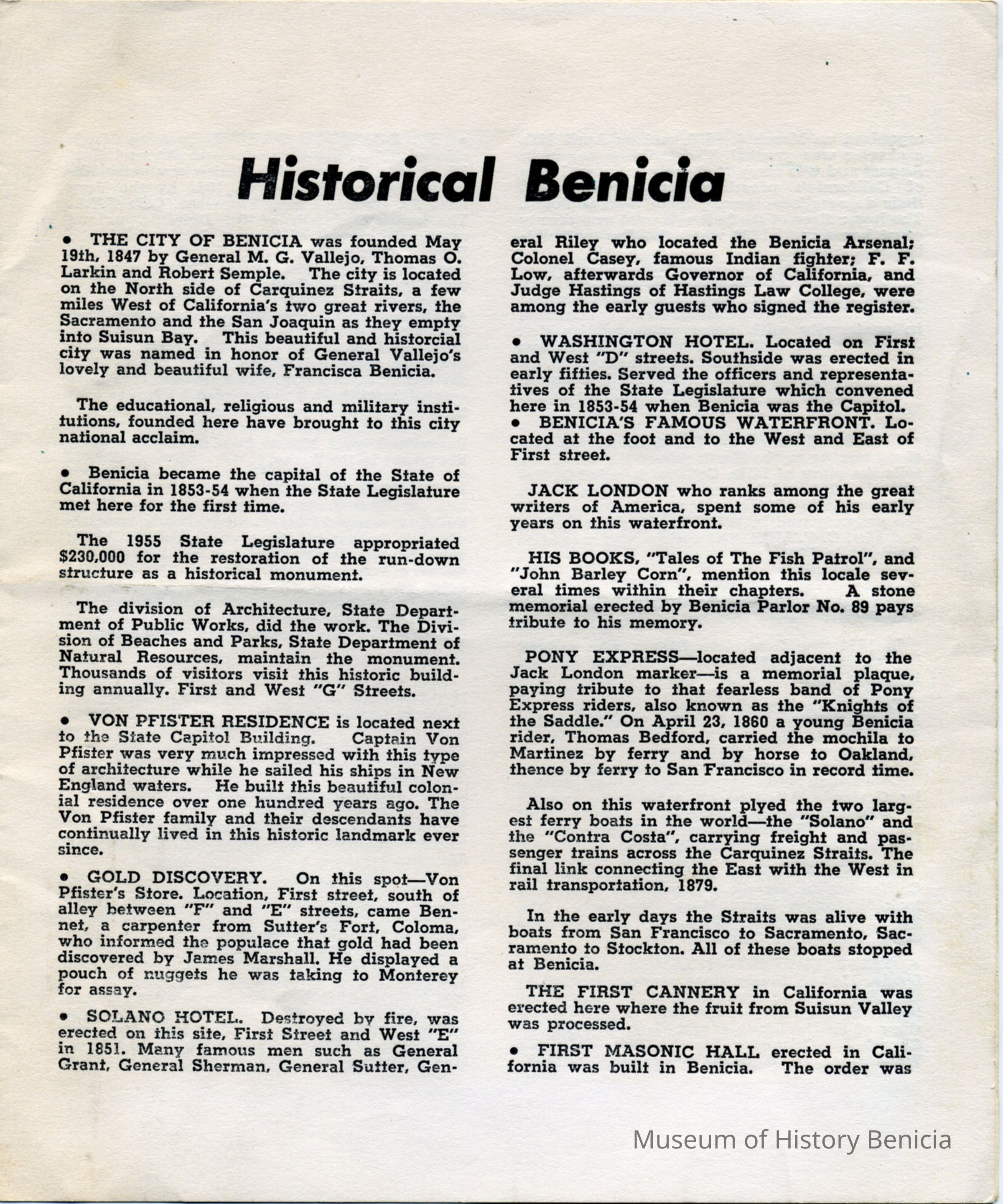 This is a brochure listing Benicia's historical past. It was created in 1965 by John J. O'Grady to compliment the Historical Society's tour of Benicia on 10/9/1965Collection