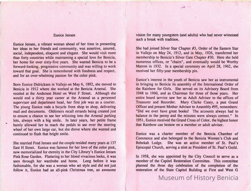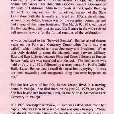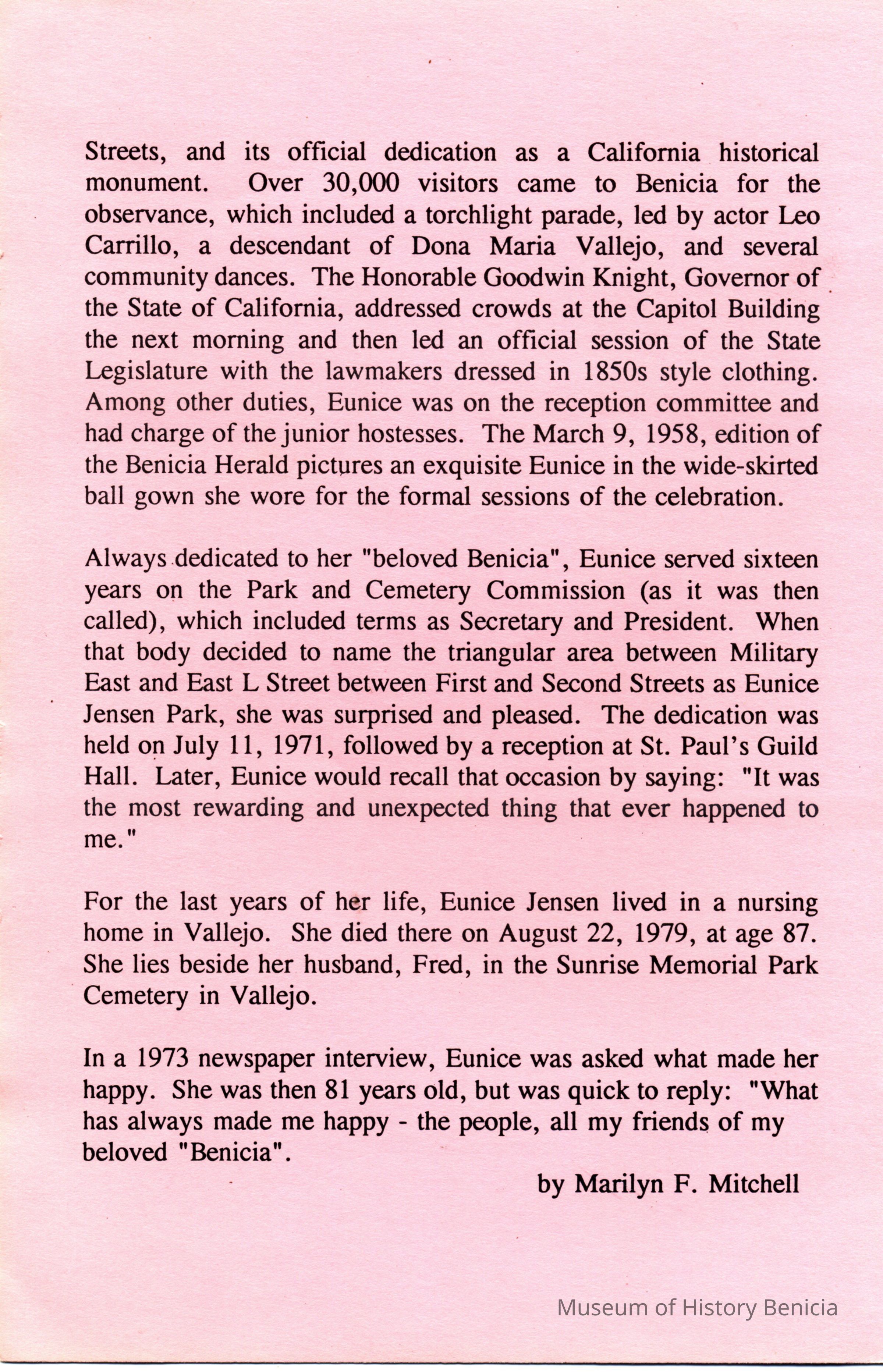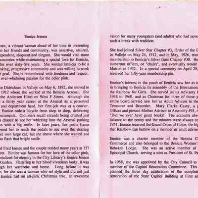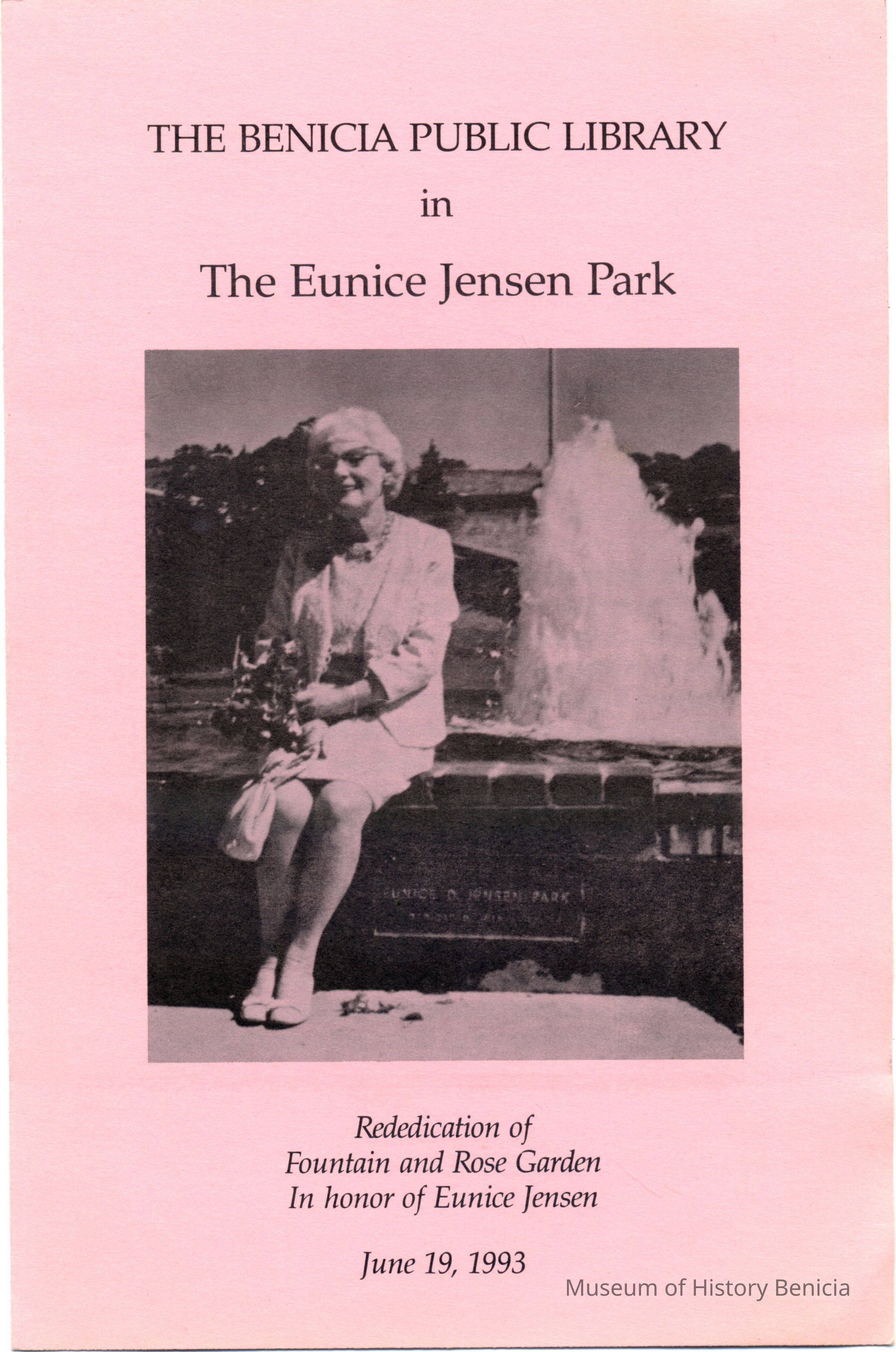 This is a brochure for the rededication of the Eunice Jensen Park in Benicia. It shows a picture of Eunice Jensen on the front and has a biography of her inside.Collection