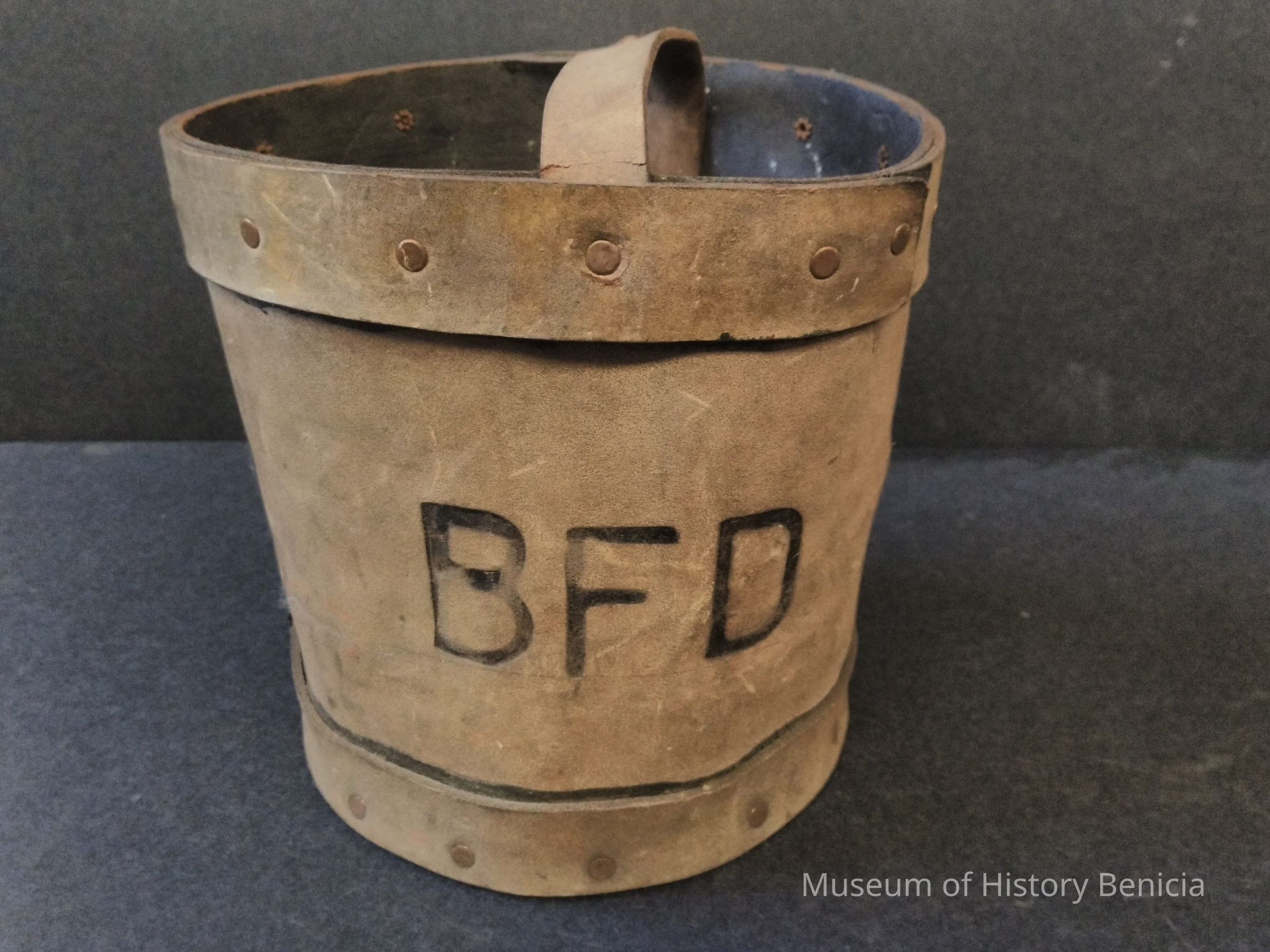 Leather Fire Vucket with copper rivets and BFD "branded" into the bucket. Bucket retains offset handle; 1.3 gallon capacity