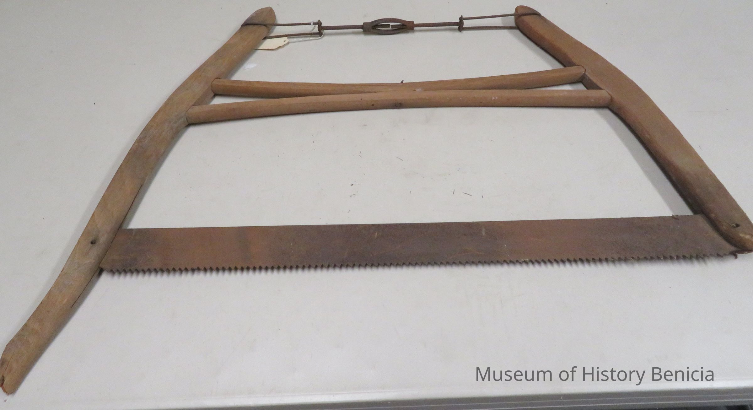 2 wood sides, one longer than the other, with metal saw blade between. A metal turnbuckle brace spans the top and 2 wood dowels brace the middle.