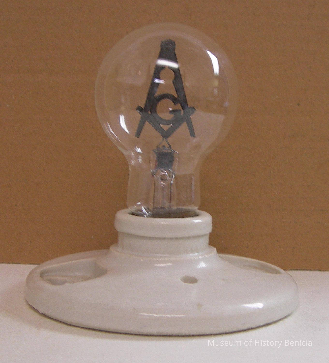 Light fixture holding a clear bulb inside of which is a metal symbol of the Fraternal Order of Masons - the compass and letter G; the bulb is screwed into a white ceramic fixture;