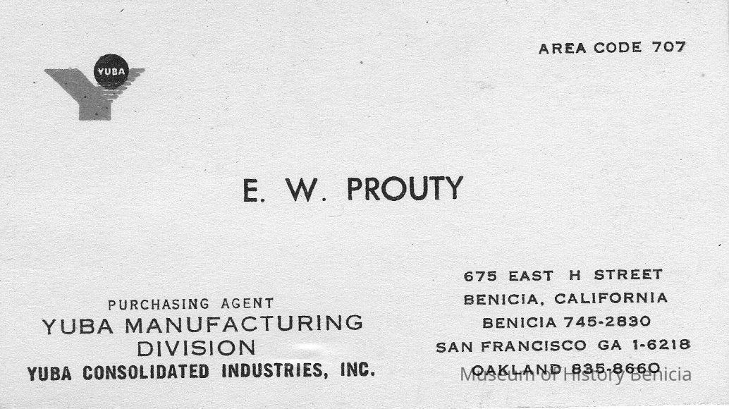 White card with turquoise "Y" in upper left corner , with black dot with "Yuba in center". At center: "E. W. Prouty." Lower left: "Purchasing Agent/Yuba Manufacturing/Division..." Addresses and tel. nos at right.