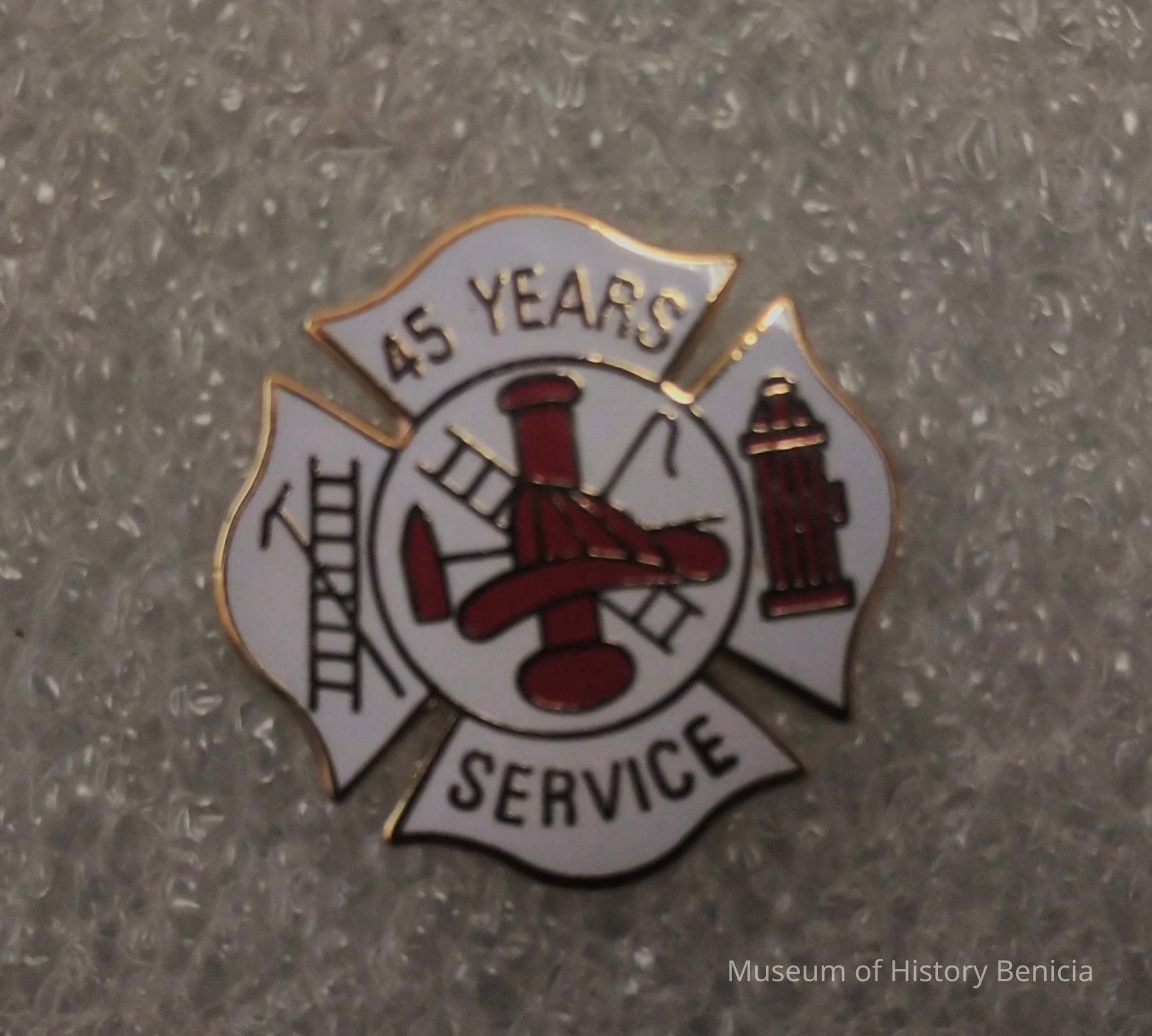 Red and White Maltese Cross Benicia Volunteer Fire Service Volunteer Recognition Pin - 45 Years of Service