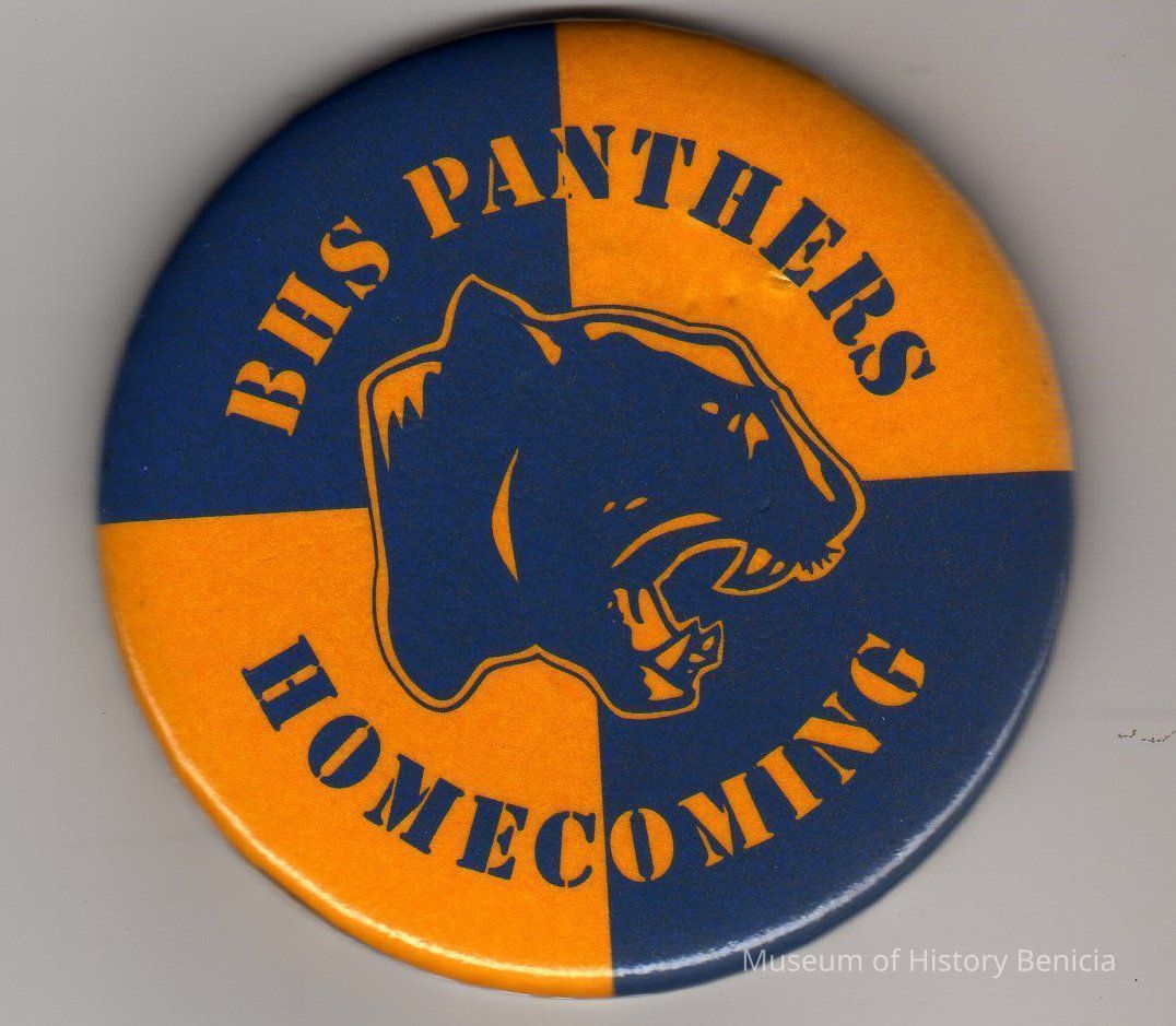 Round Blue and Gold button with BHS PANTHERS HOMECOMING printed around the edge with a panther head in the center. (pin back)