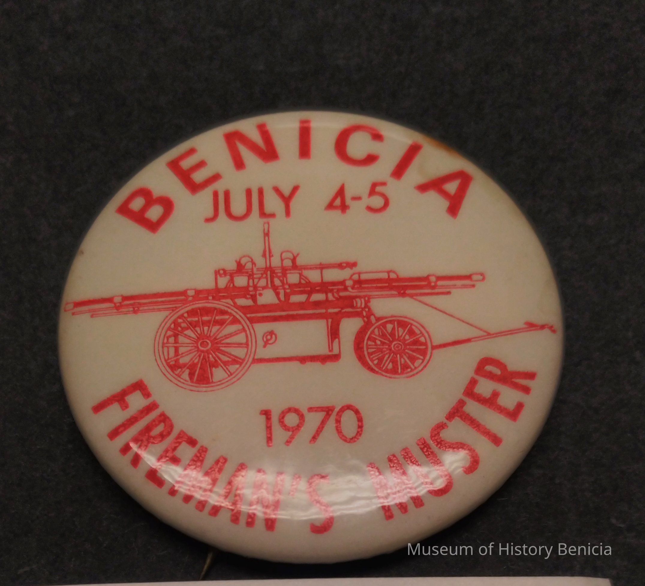 Small white and red Benicia Fireman's Muster July 4-5 1970 Pin