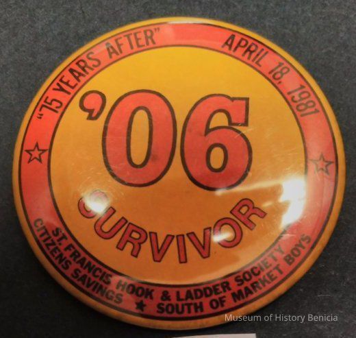 Red and Orange 1906 Commemorative Pin - 75 Years After April 18, 1981 '06 Survivor St. Francis Hook and Ladder Society Citizens Savings, South of Market Boys