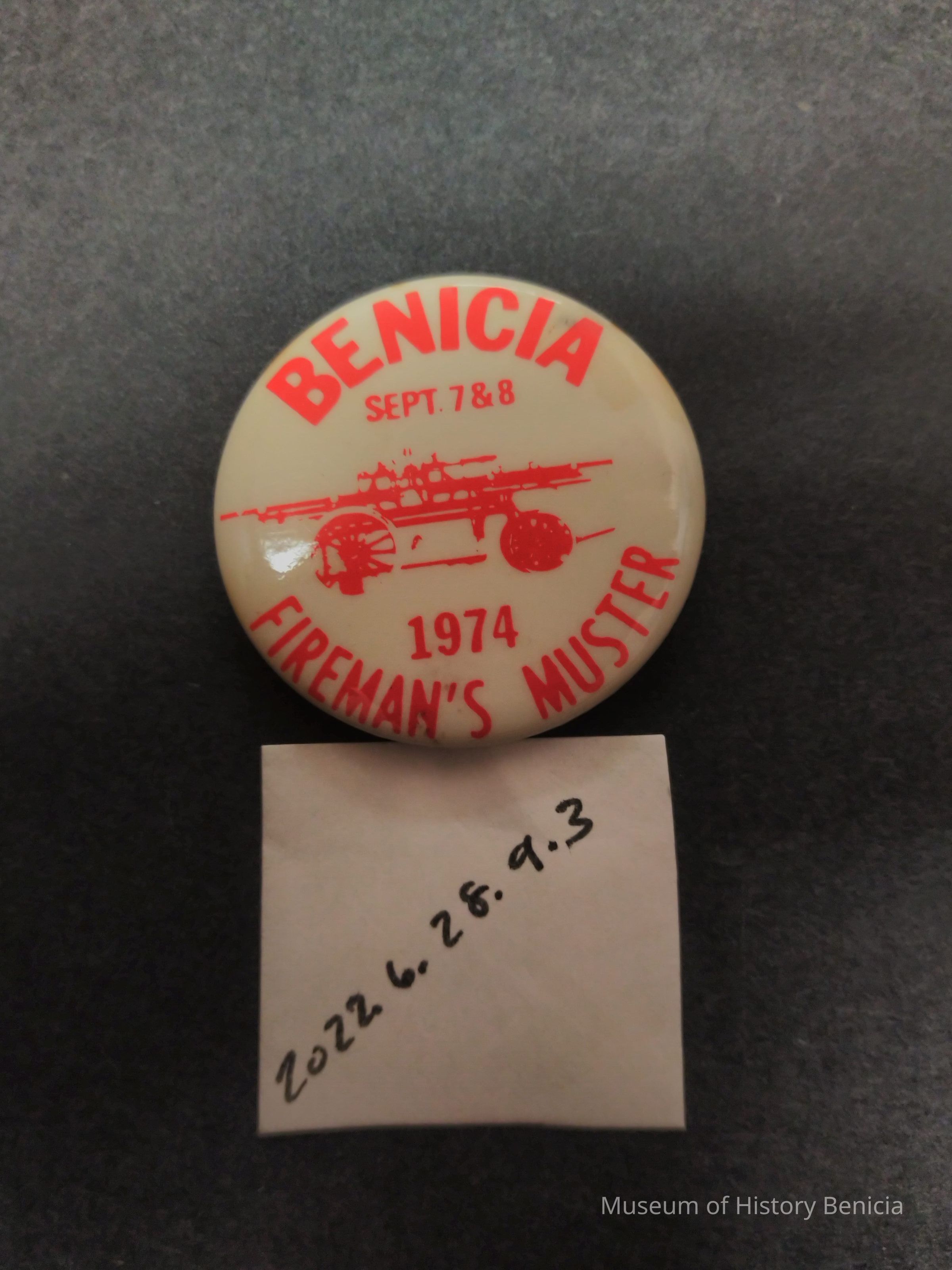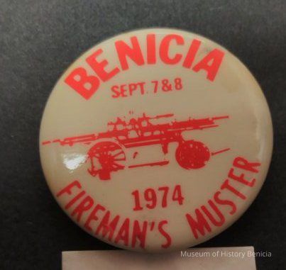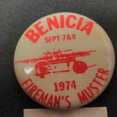 Red and White Benicia Fireman's Muster Pin - Sept 7 & 8 1974