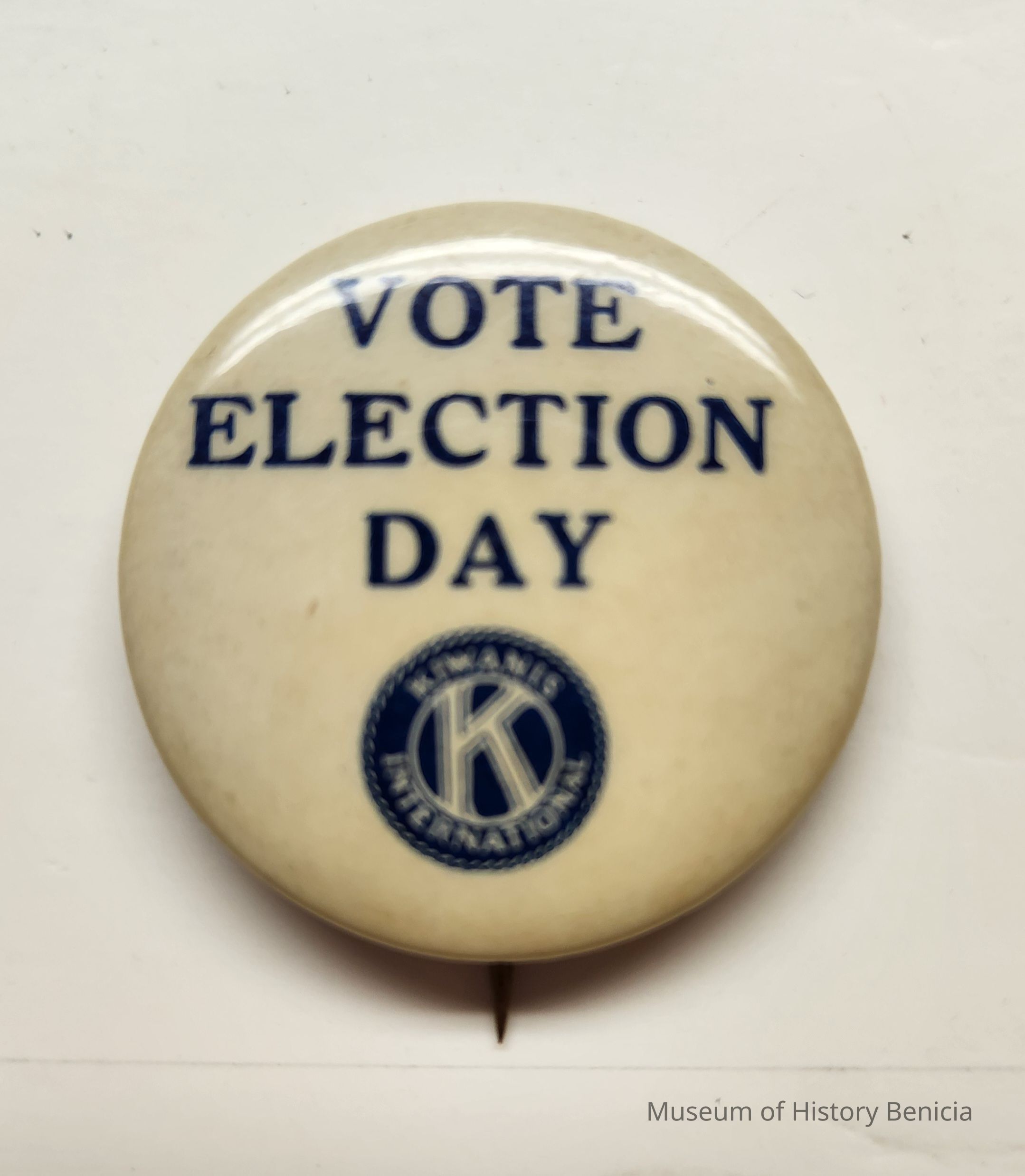 Lapel button: "Vote Election Day" with Kiwanis logo, blue ink and white background; straight pin on back.