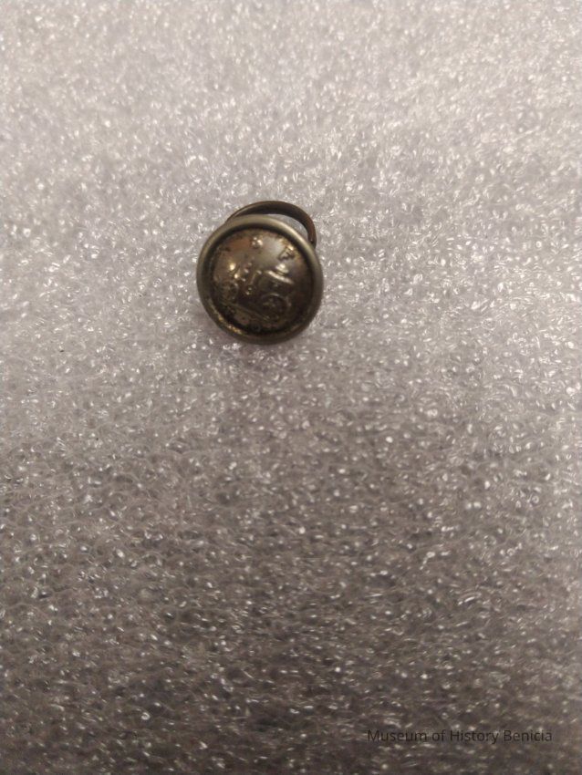 Silver colored metal and brass button - S.F.F.D. on front with depictino of a steam pumper - button retains ring through shank for removal during laundry - made bby Pacifi Button Co. S. Francisco CALCollection