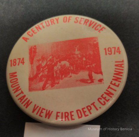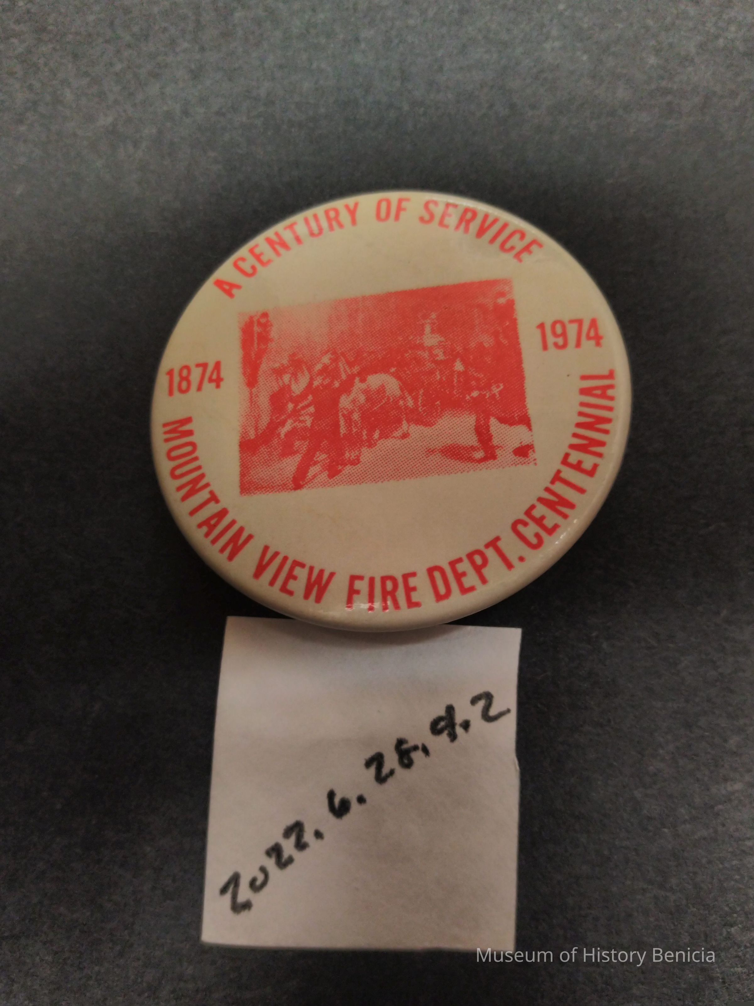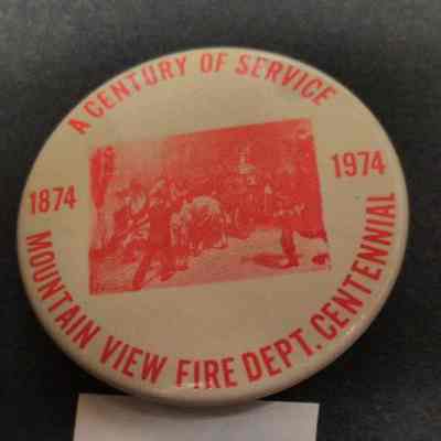 White and Red Pin - A Century of Service - Mountain View Fire Dept. Centennial 1874-1974
