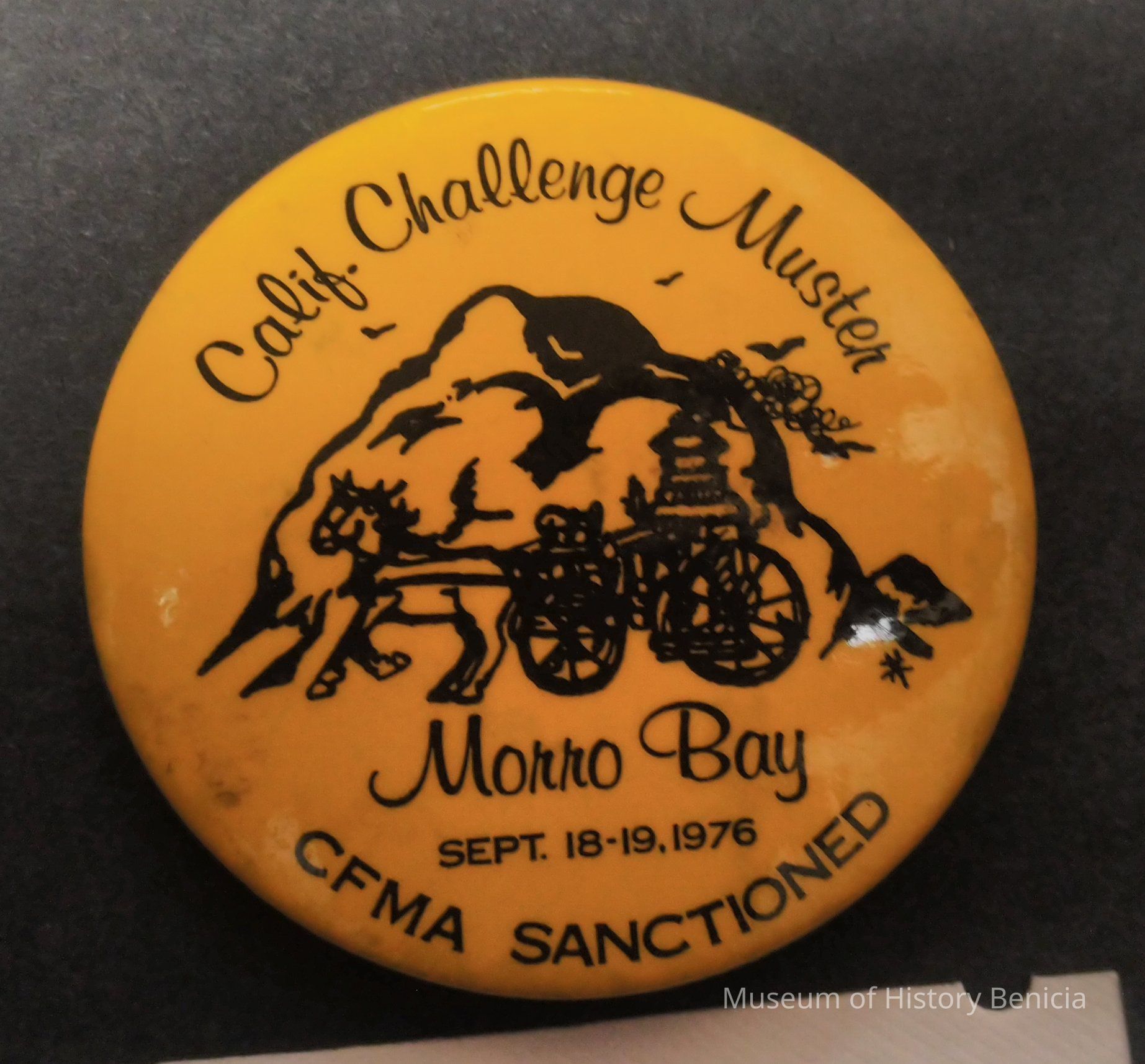 Yellow/Orange and Black Fire muster Pin - Calif. Challenge Muster - Morro Bay CFMA Sanctioned - Sept. 18-19, 1976