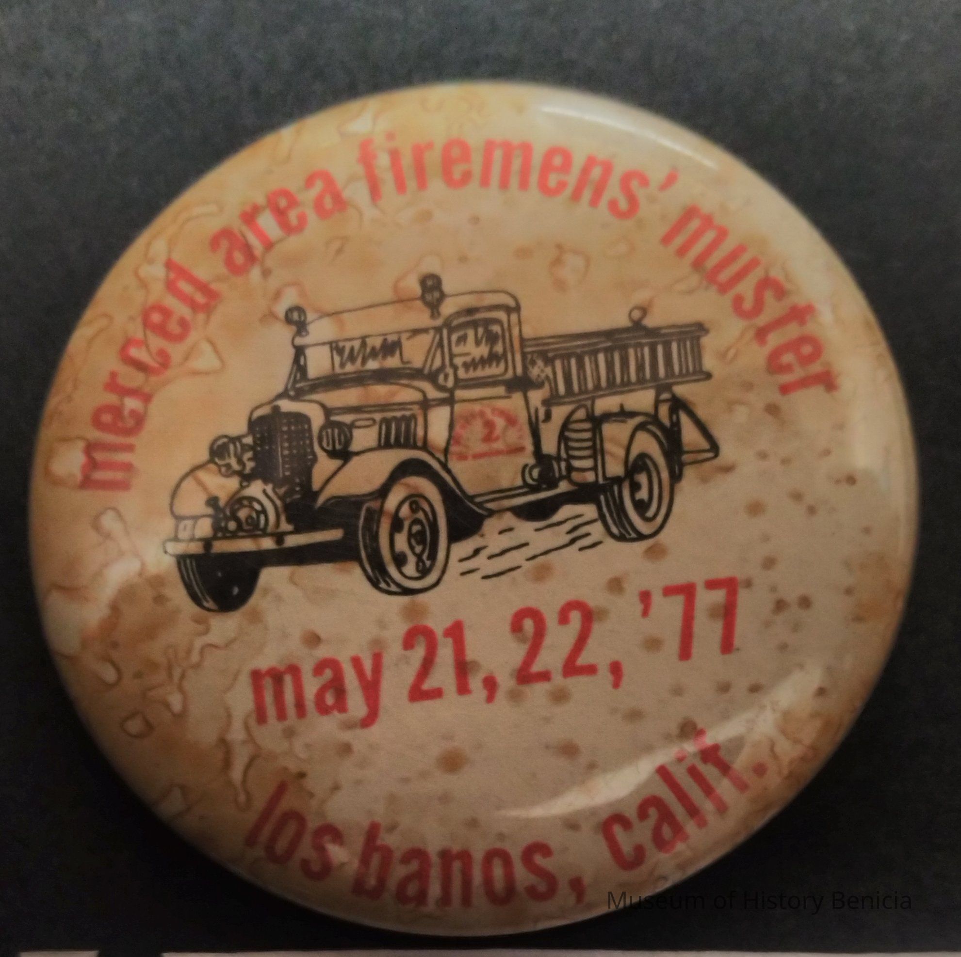 Red and White Fire Muster Pin - Merced Area Firemens' Muster May 21, 22, '77 Los Banos Calif