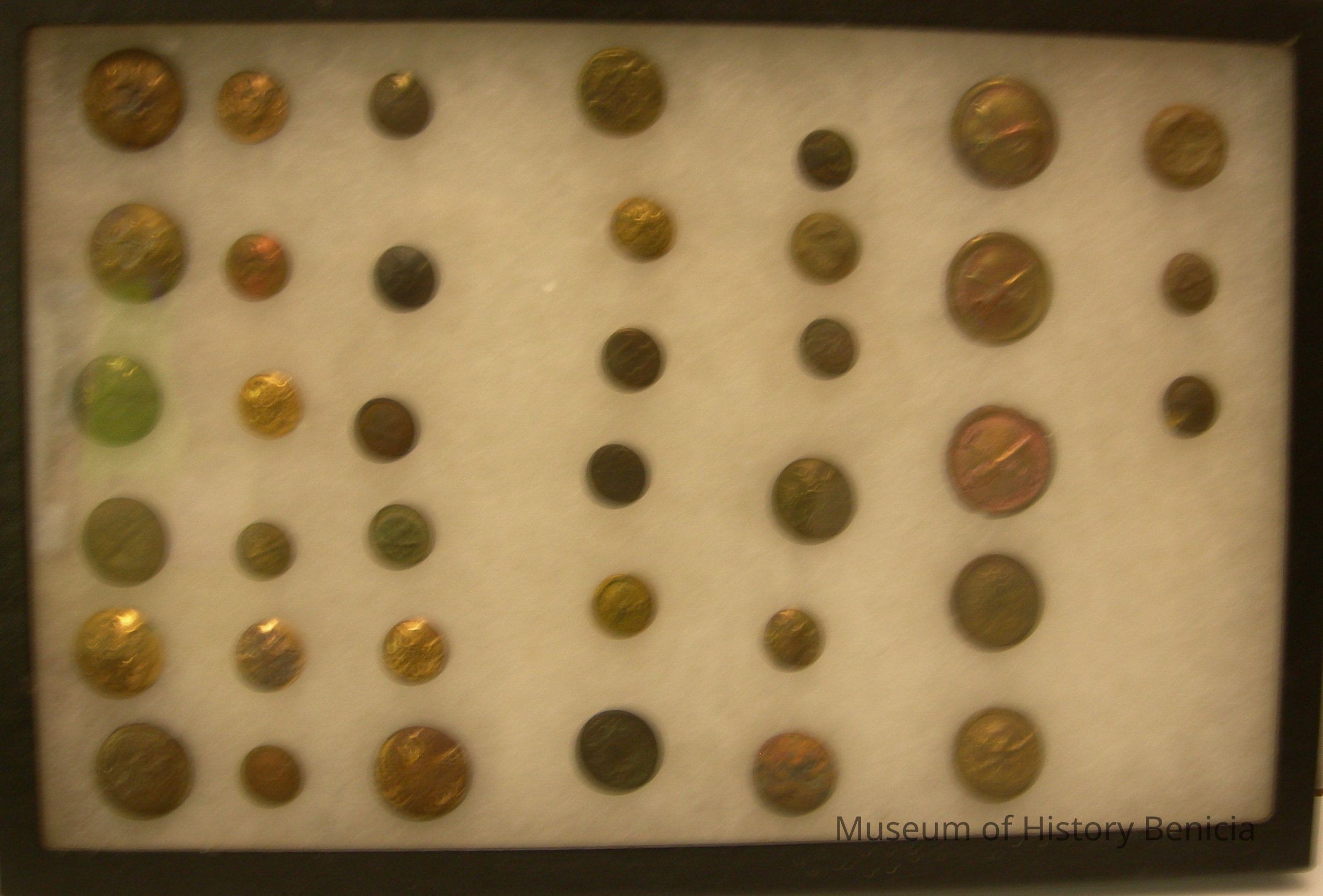 A display case of 38 military buttons found at the Arsenal; there are various types, mostly brass, some are badly deteriorated; there are various insignias: eagles with spread wings mostly, crossed cannons, crossed swords, one has an anchor, one has a woman w/ letters N.G.C.;