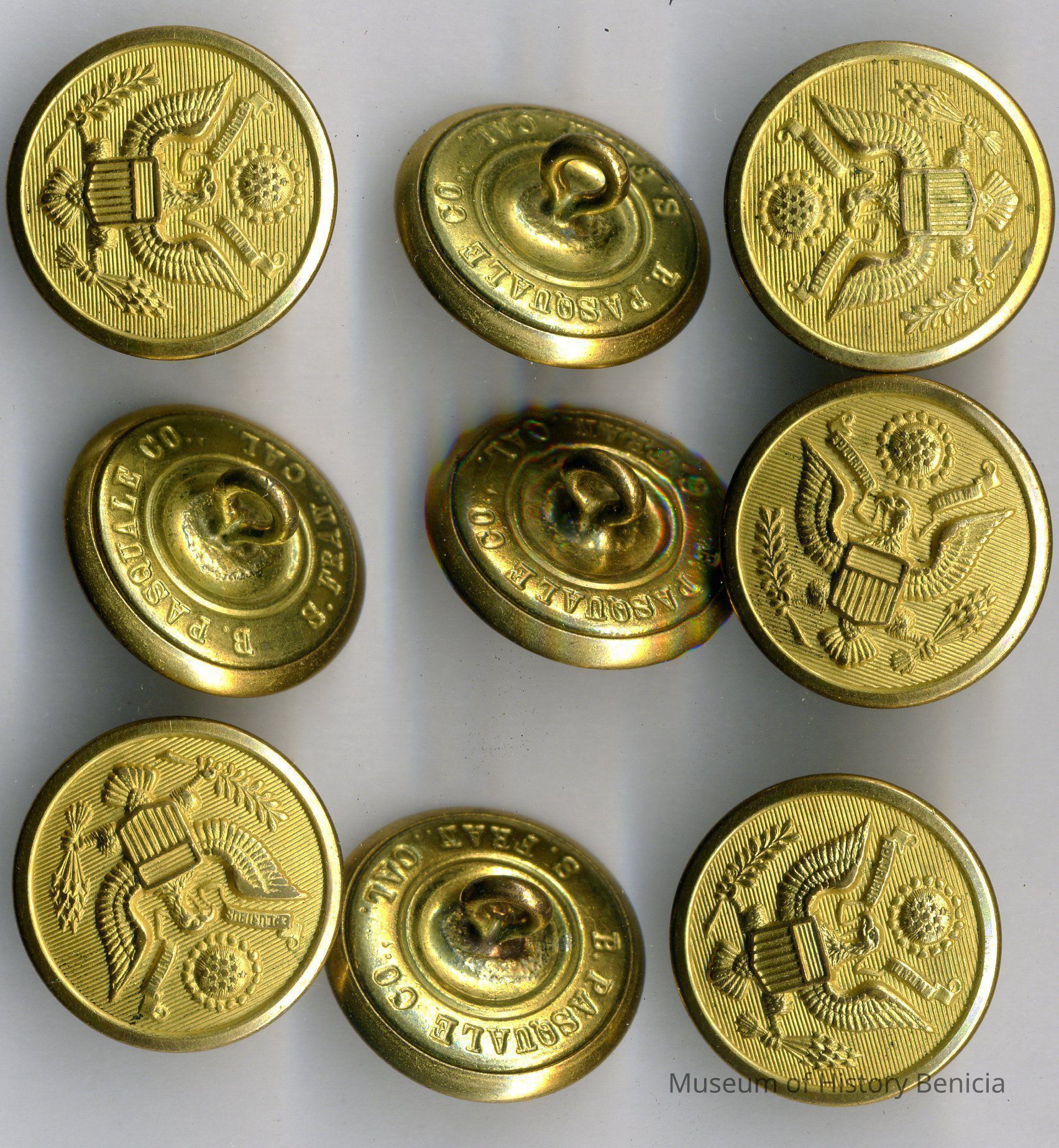 Military uniform buttons. These were made by B. Pasquale Co. San Francisco, Cal. They have an American eagle on the front. There are 9 buttons in this group.Collection