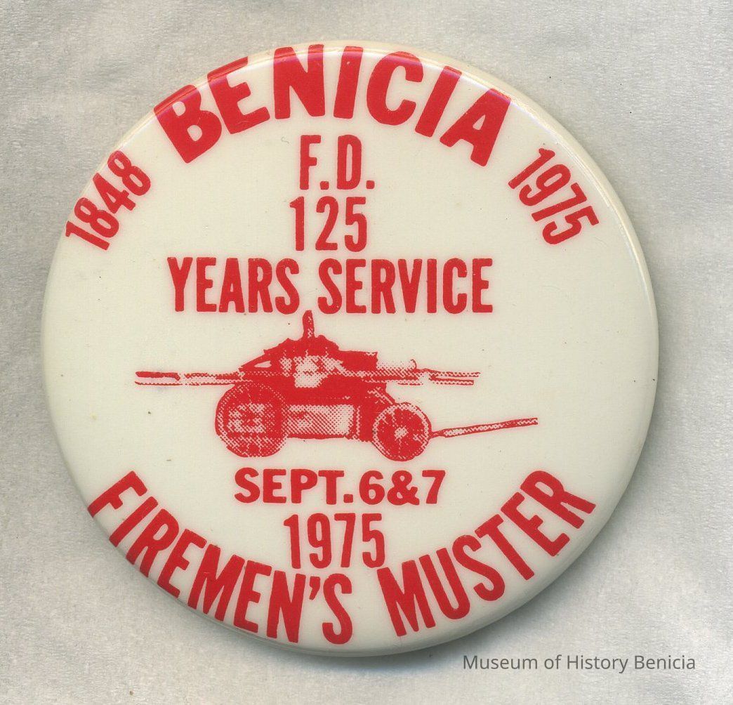 Button - Red lettering on white background: 1848 Benicia 1975 / F.D. / 125 / Years Service / drawing of old fire engine / Sept. 6 & 7 / 1975 / Firemen's Muster