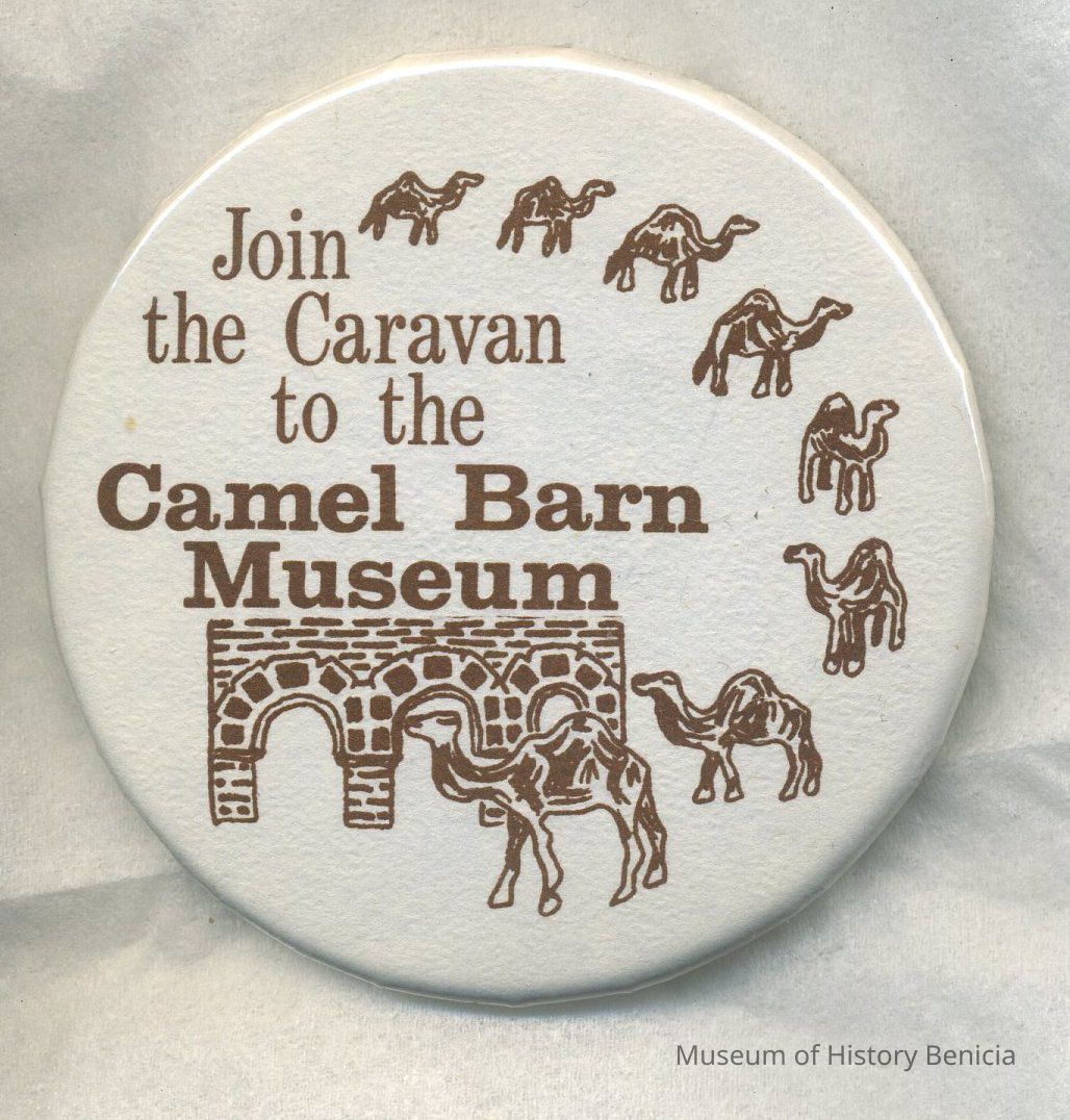 Button - Brown lettering on white background: "Join the Caravan to the Camel Barn Museum" with a "parade" of camels along the edge 2-1/4" diameterCollection