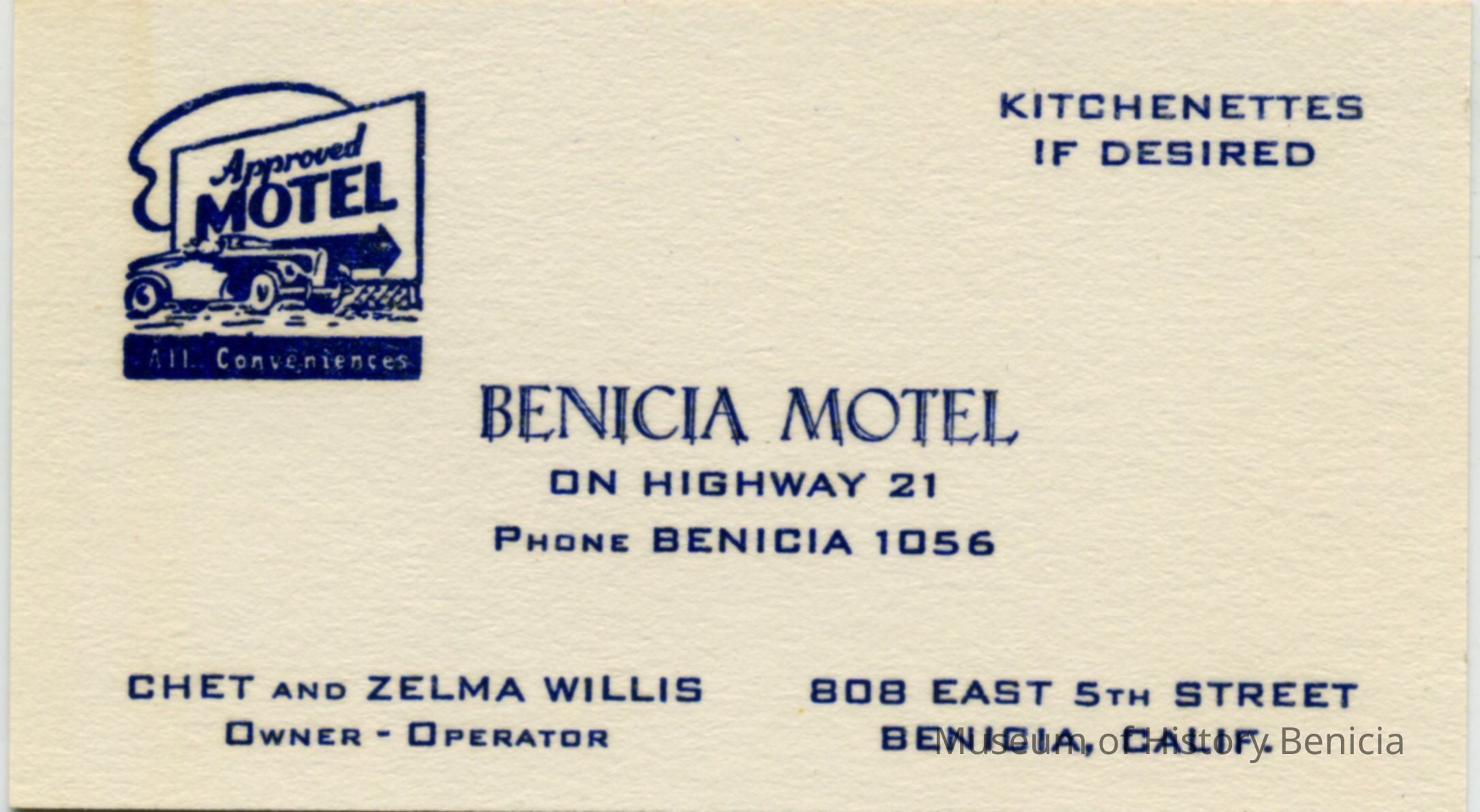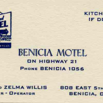 This is a business card for the Benicia Motel on Highway 21 in Benicia. It shows that it was owned by Chet and Zelma Willis and is at 208 East 5th Street. They had kitchenettes "if desired".Collection