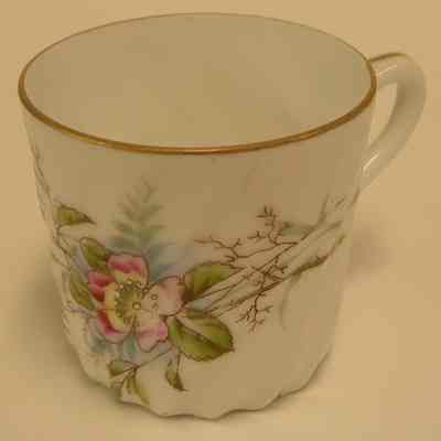 China demitasse cup with a flower and greens on a white background; there is gold on the rim and handle; on the bottom: the number 3342 and in green Germany and a flying bird in an oval
