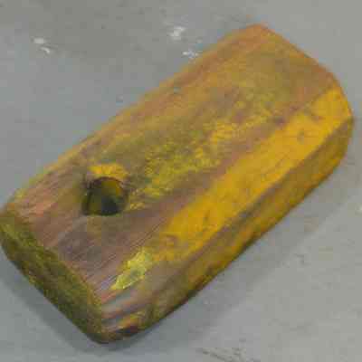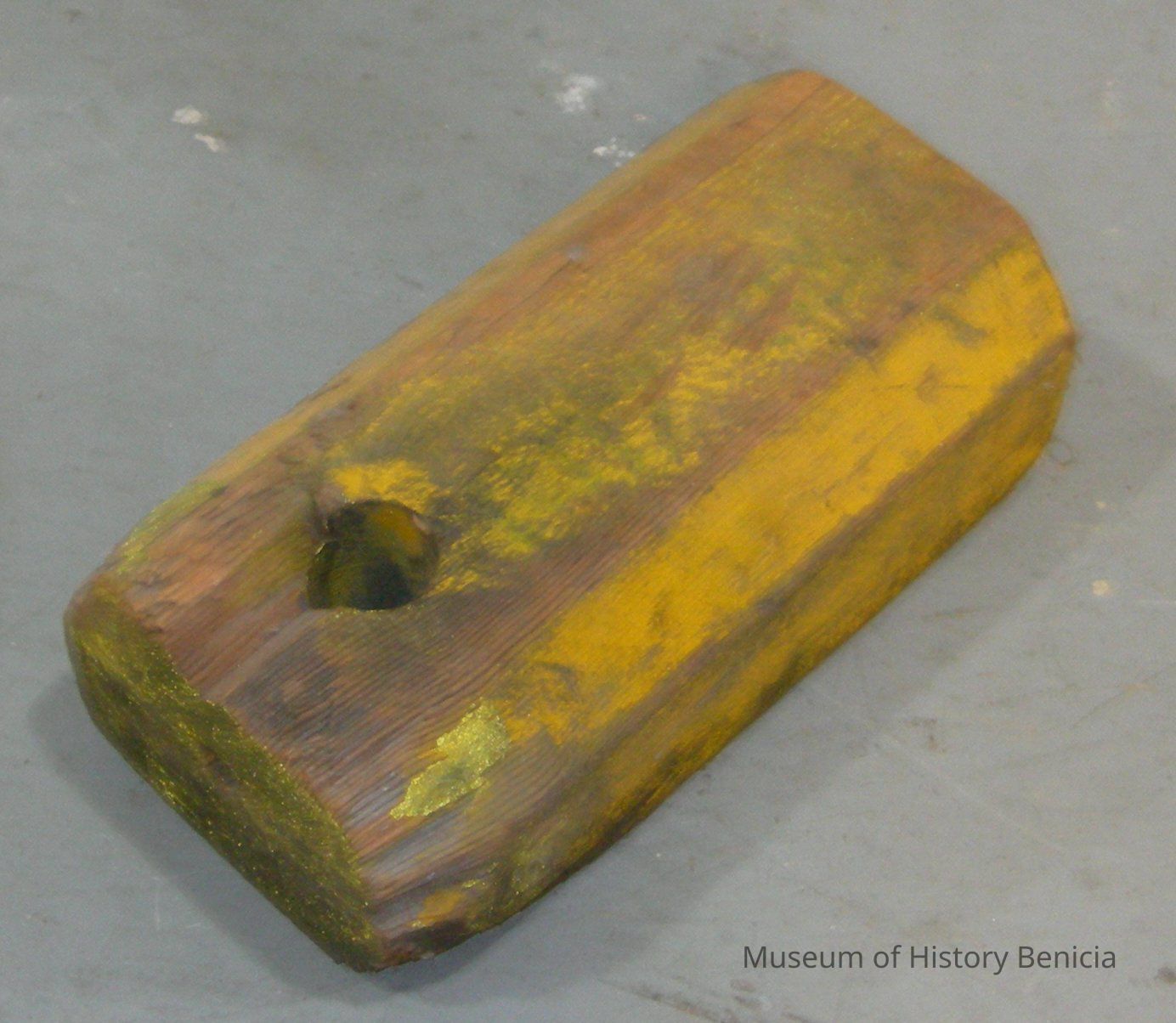 Wheel chock made of wood and painted yellow. It was originally used at the Benicia Arsenal with parked vehicles. At one time there was a rope looped through the holes at one end for ease of movement.