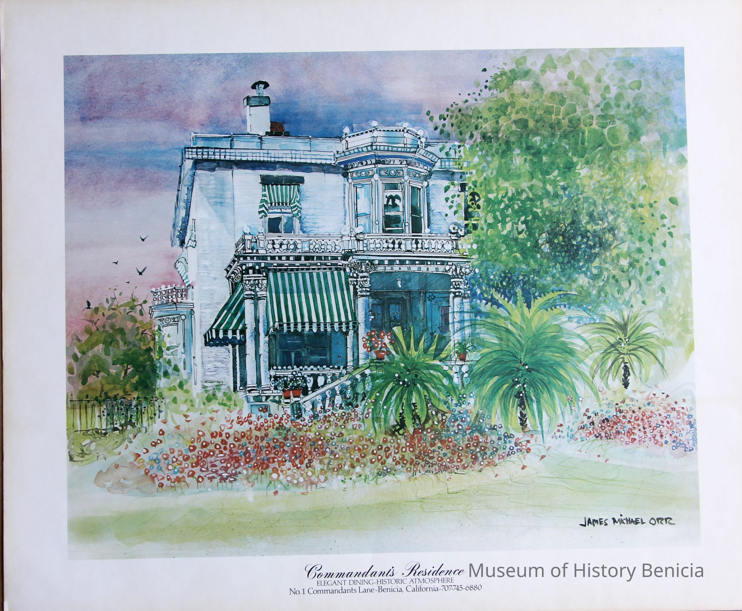 A poster (24" x 18") of the Commandant's Residence in Benicia. This is a pastel shaded poster of the historic house done by James Michael Orr. It was done at a time when there was a restaurant in the Commandant's Residence. There have been several changes in how the house has been used over the years.
