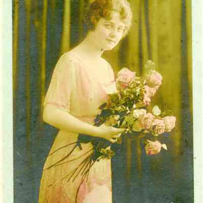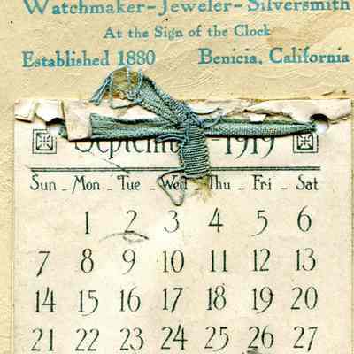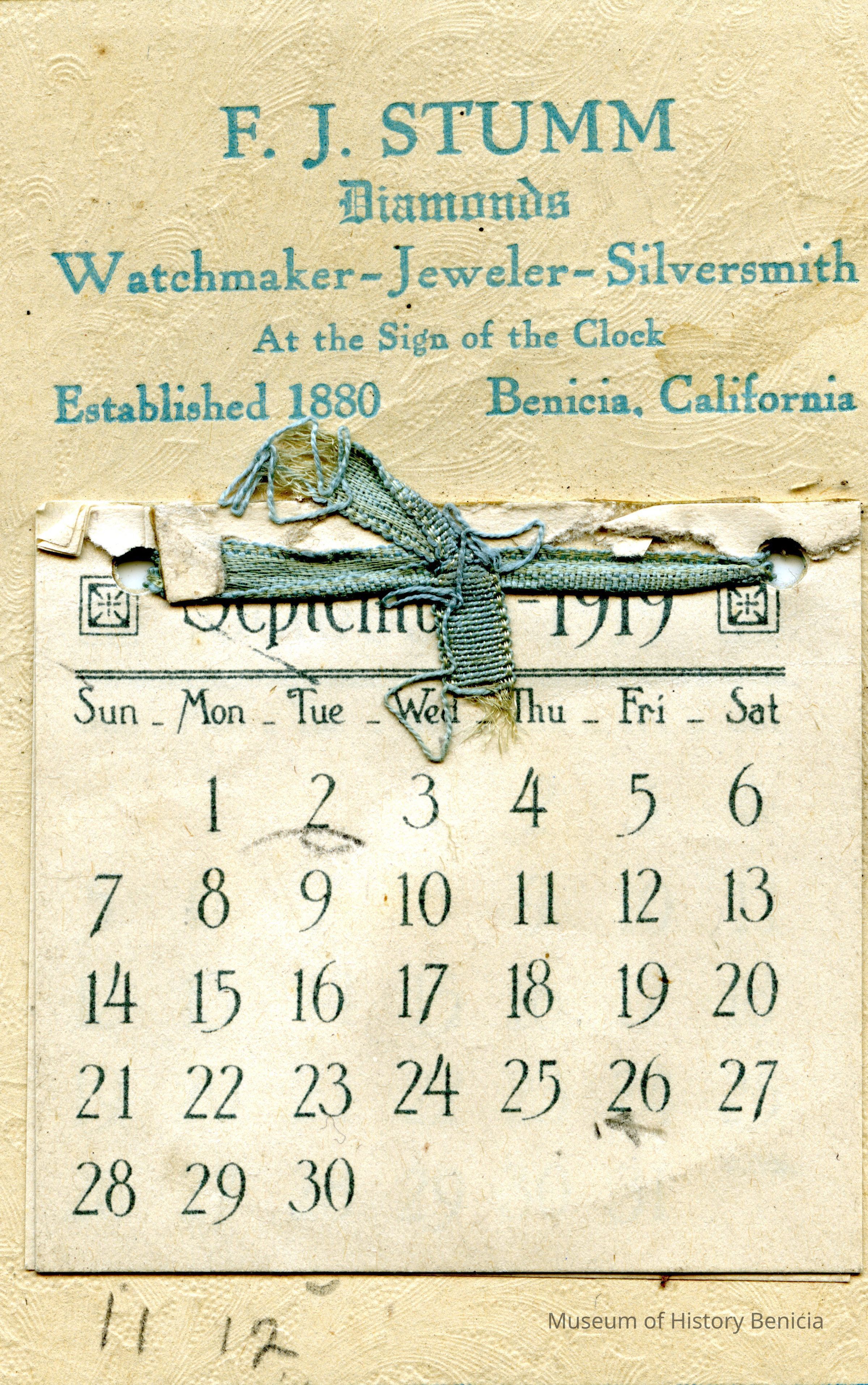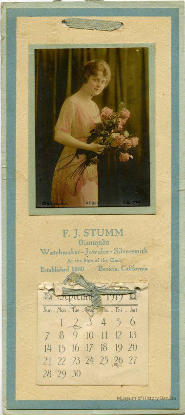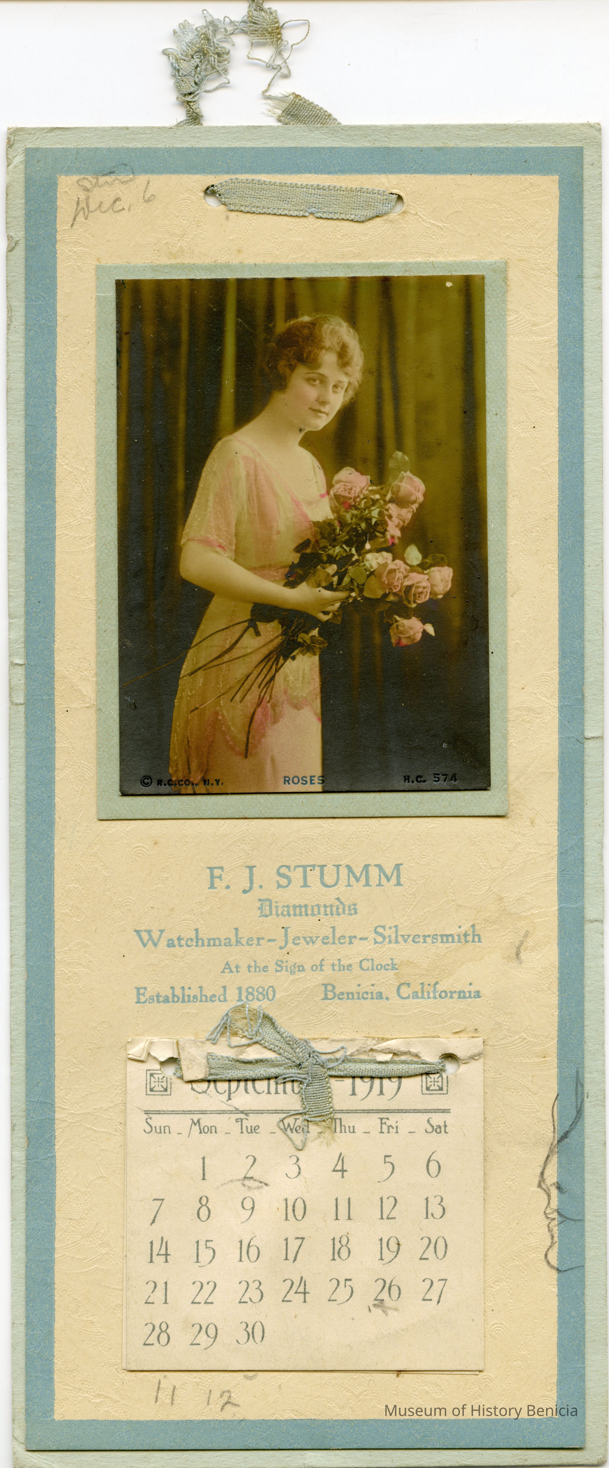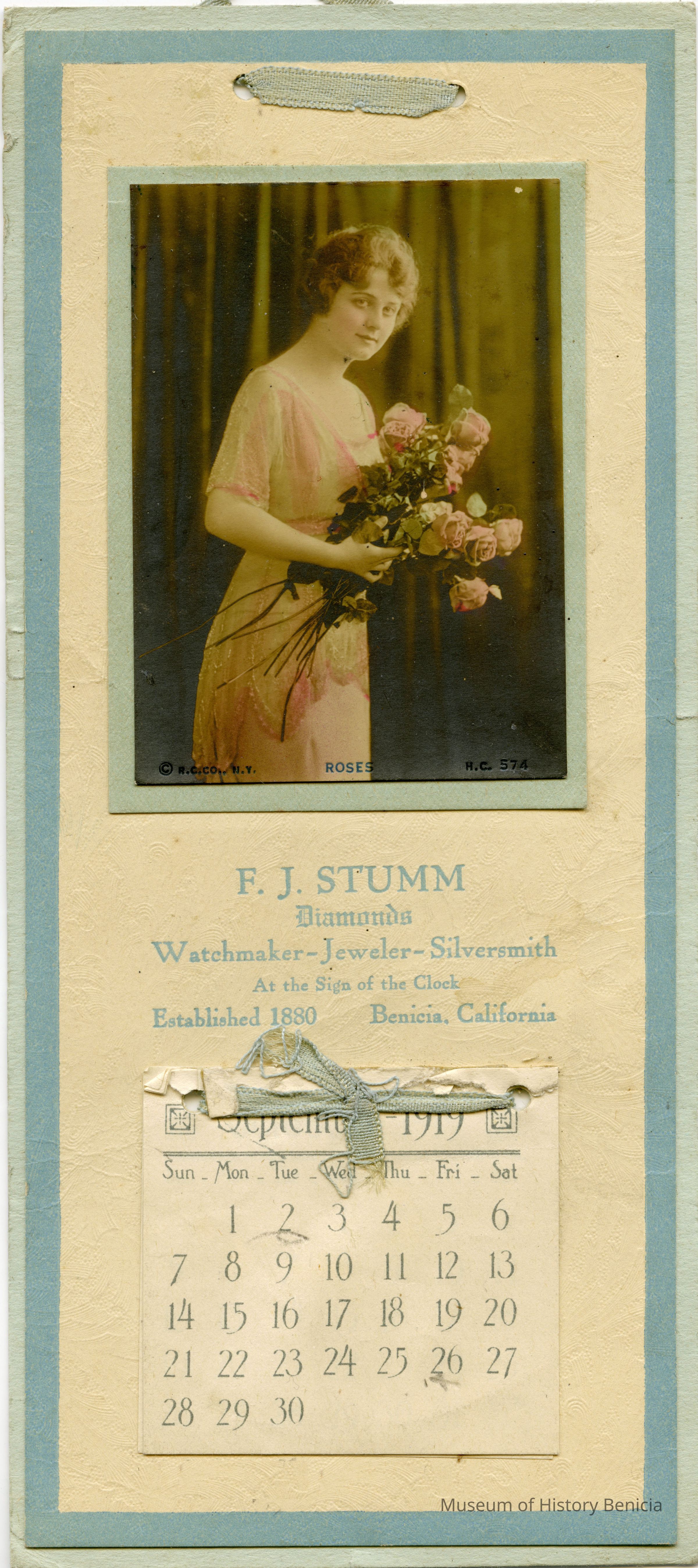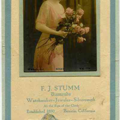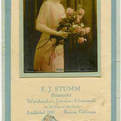 A small calendar (4" x 9") advertising F.J. Stumm jewelers. It is for 1919 and months thru August have been removed. Someone has drawn a face on the side and some other notations have been made on the calendar. It has a picture of a woman holding a bunch of roses above the name of the store. It was produced by the R.C. Co. of New York.