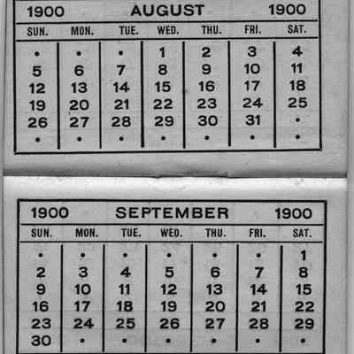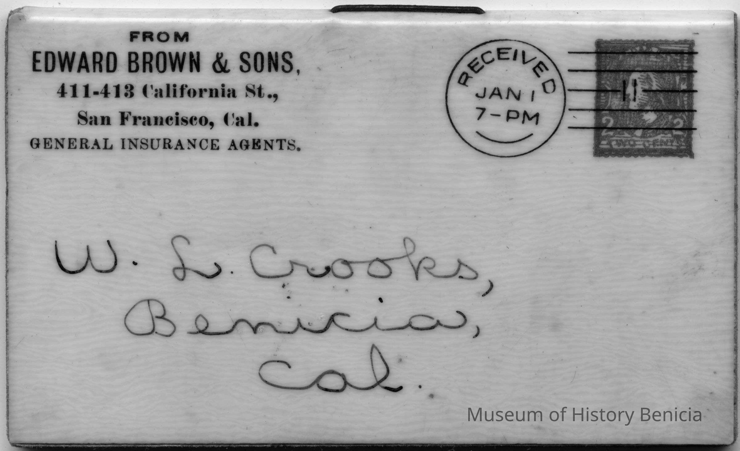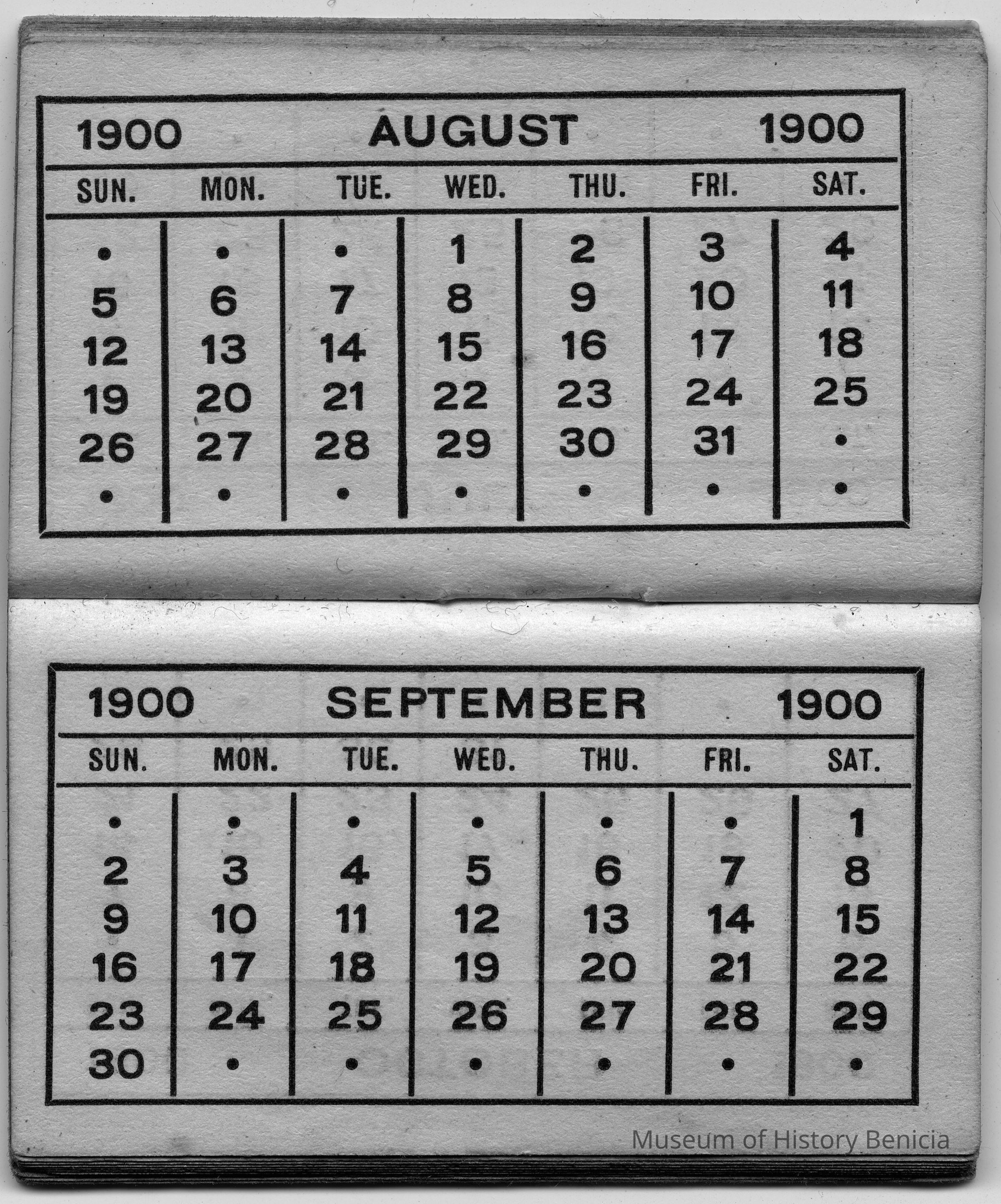 Small book-like calendar to "W. L. Crooks Benicia, Cal." from Edward Brown & Sons in San Francisco, "General Insurance Agents". Calendar is for the year 1900, with a page for each month and blank - yellowed - papers in front and back. A tiny calendar for 1901 is located at very back.Collection