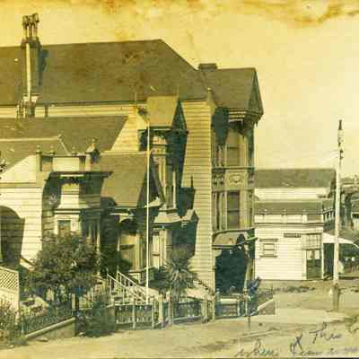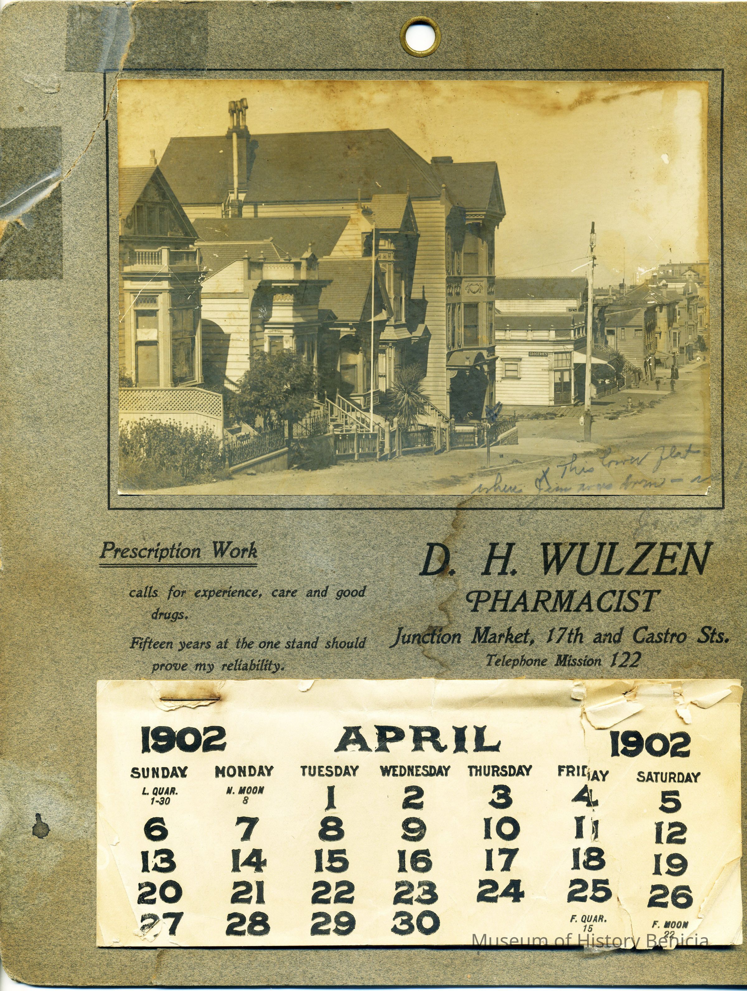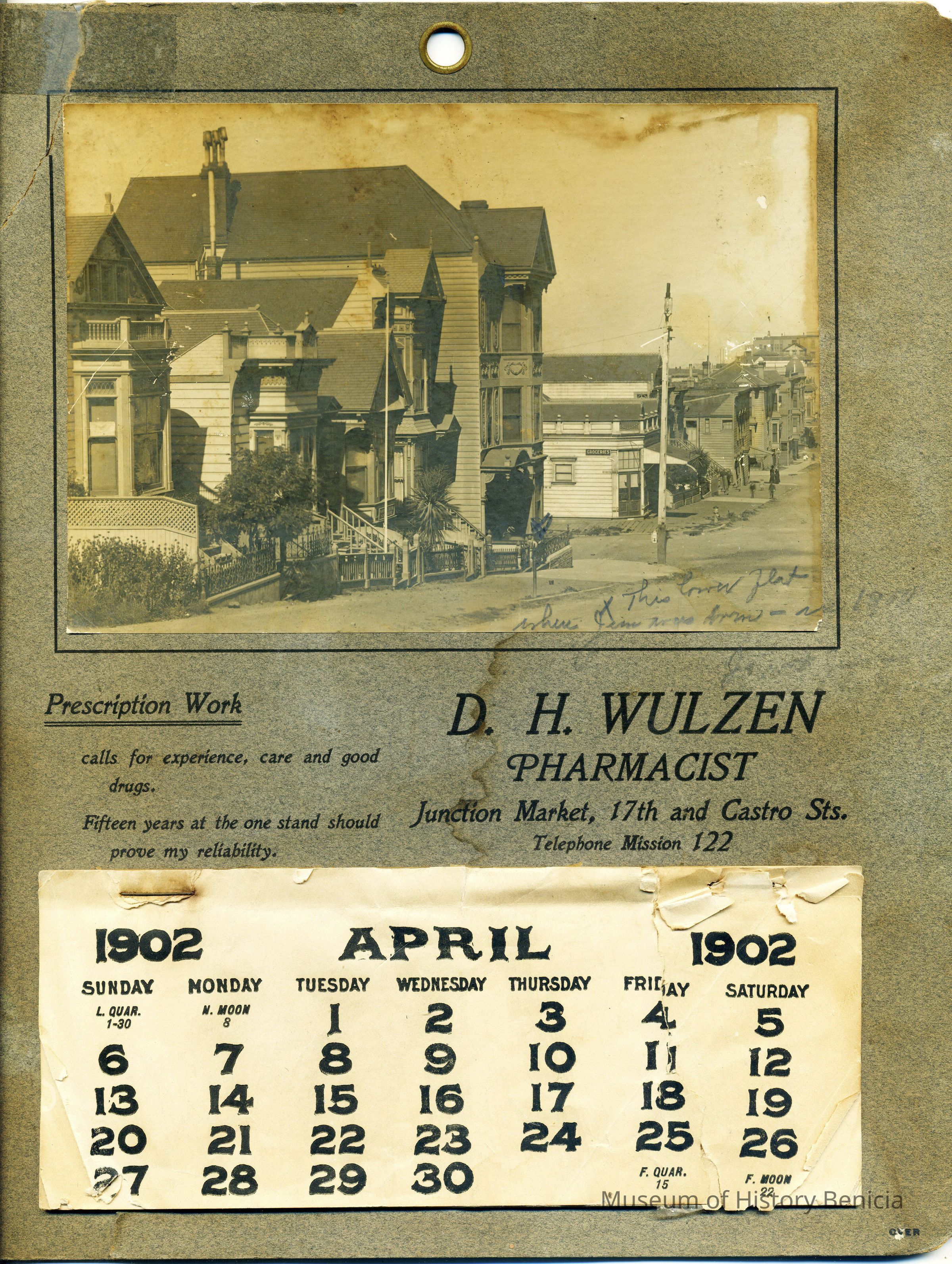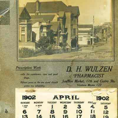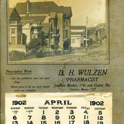 A calendar for the business of D.H. Wulzen a San Francisco Pharmacist. It shows a photo of his offices at the junction of Market, 17th and Castro in 1902. Someone has written on the calendar "This corner flat where Jim was born - ?? " There is more to the inscription but is not legible.