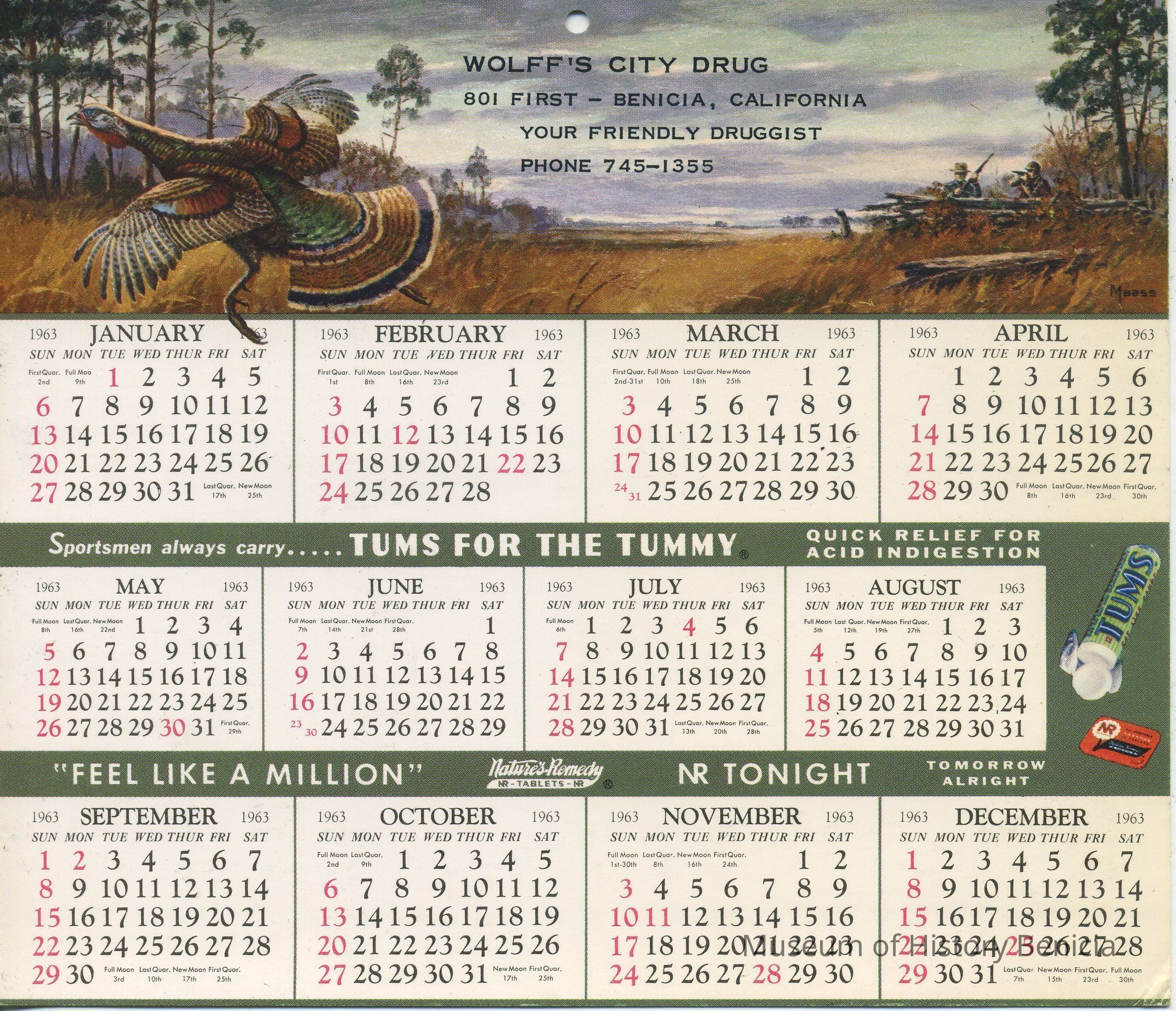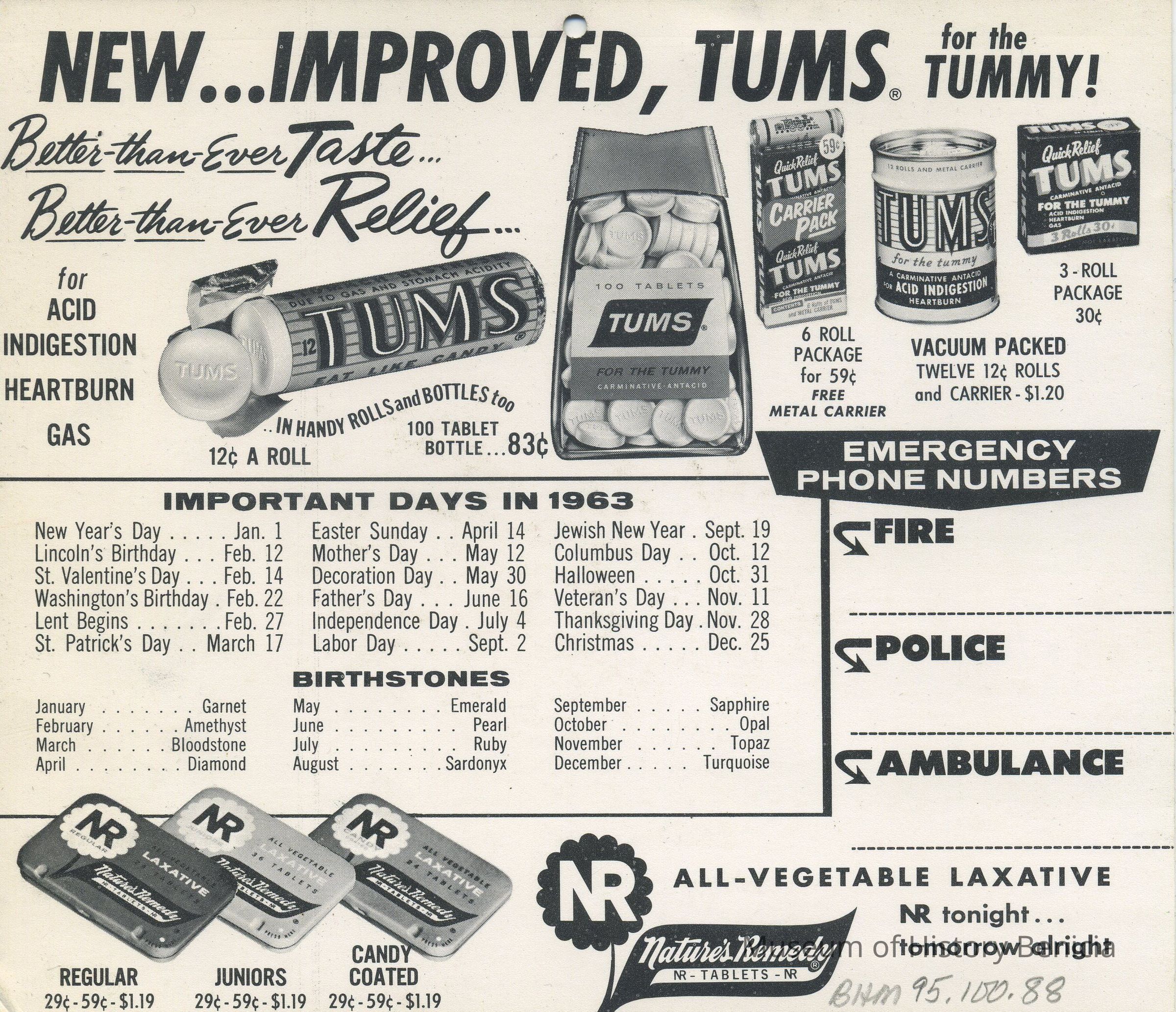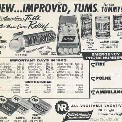 On Back: (B/W) advertisements for Tums and Nature's Remedy All Vegetable Laxative; listed are important days in 1963 and birthstones for each month; also spaces for emergency phone numbers: Fire, Police, Ambulance.